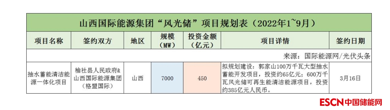 截至2022年9月30日,山西國際能源集團(tuán)共簽約(規(guī)劃)1個(gè)風(fēng)光儲項(xiàng)目,項(xiàng)目規(guī)模為7GW,投資金額450億元。