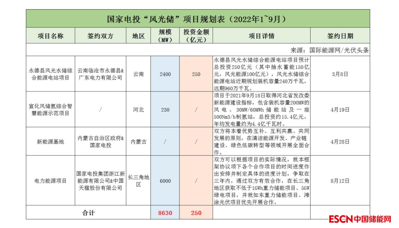 截至2022年9月30日,國家電投共簽約(規(guī)劃)4個(gè)風(fēng)光儲項(xiàng)目,明確規(guī)模共計(jì)8.63GW,有1個(gè)項(xiàng)目明確投資金額為250億元。
