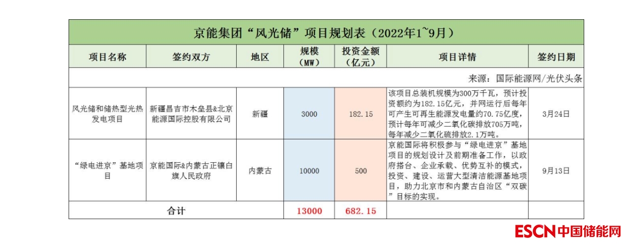 截至2022年9月30日,京能集團(tuán)共簽約(規(guī)劃)2個(gè)風(fēng)光儲項(xiàng)目,項(xiàng)目規(guī)模13GW,投資金額682.15億元。