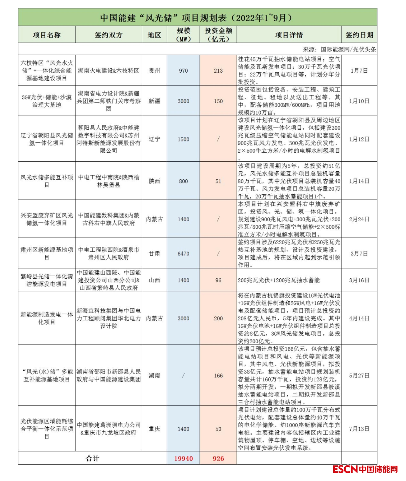 截至2022年9月30日,中國能建共簽約(規(guī)劃)10個(gè)風(fēng)光儲項(xiàng)目,明確項(xiàng)目規(guī)模共計(jì)19.94GW。此外,有7個(gè)項(xiàng)目明確投資金額,共926億元。