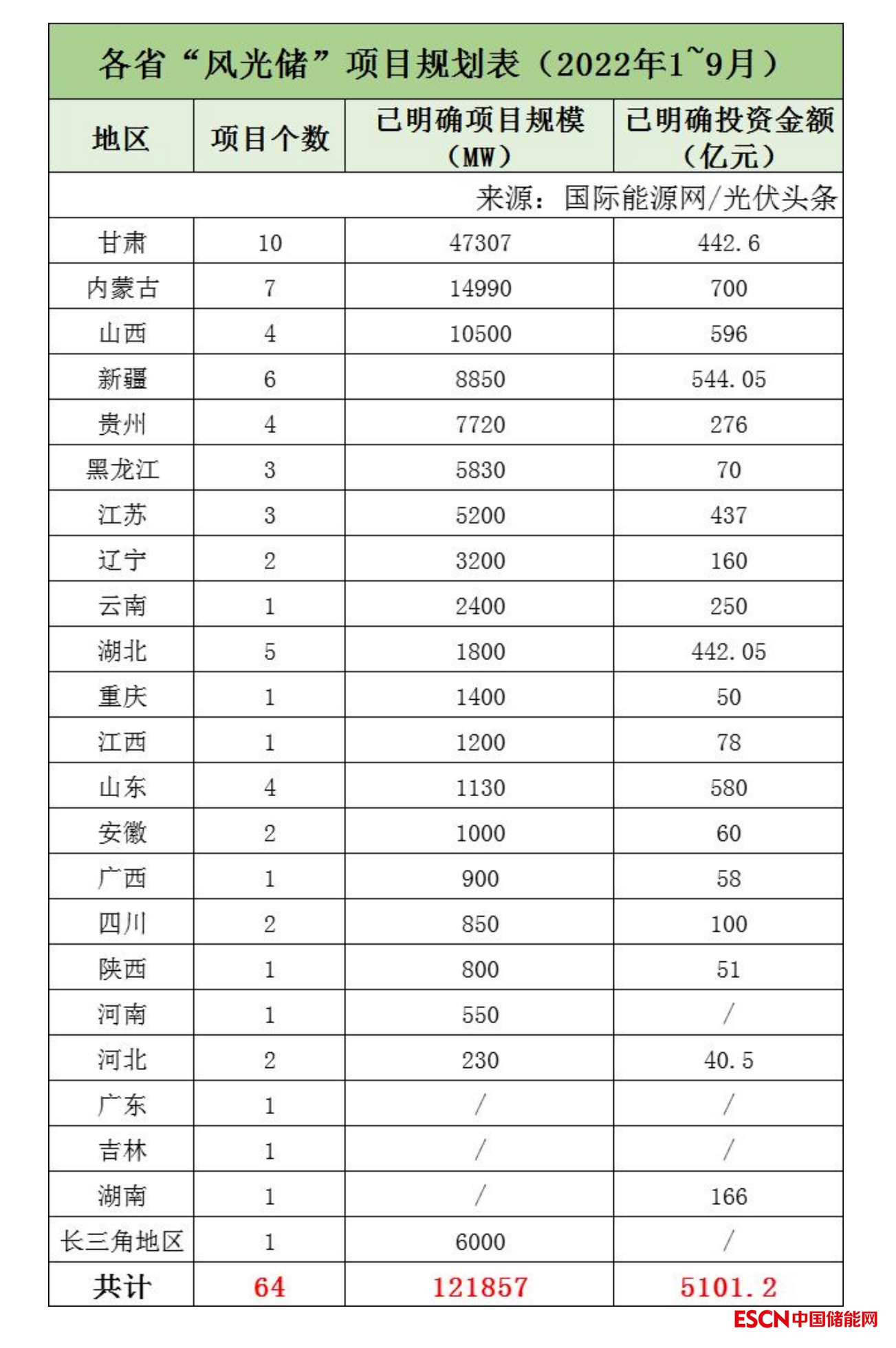 據(jù)國際能源網(wǎng)/光伏頭條(pv-2005)不完全統(tǒng)計(jì),2022年1-9月,全國共簽約/規(guī)劃風(fēng)光儲項(xiàng)目64個(gè),已明確的項(xiàng)目規(guī)模為121.857GW,已明確的投資金額為5101.2億元。