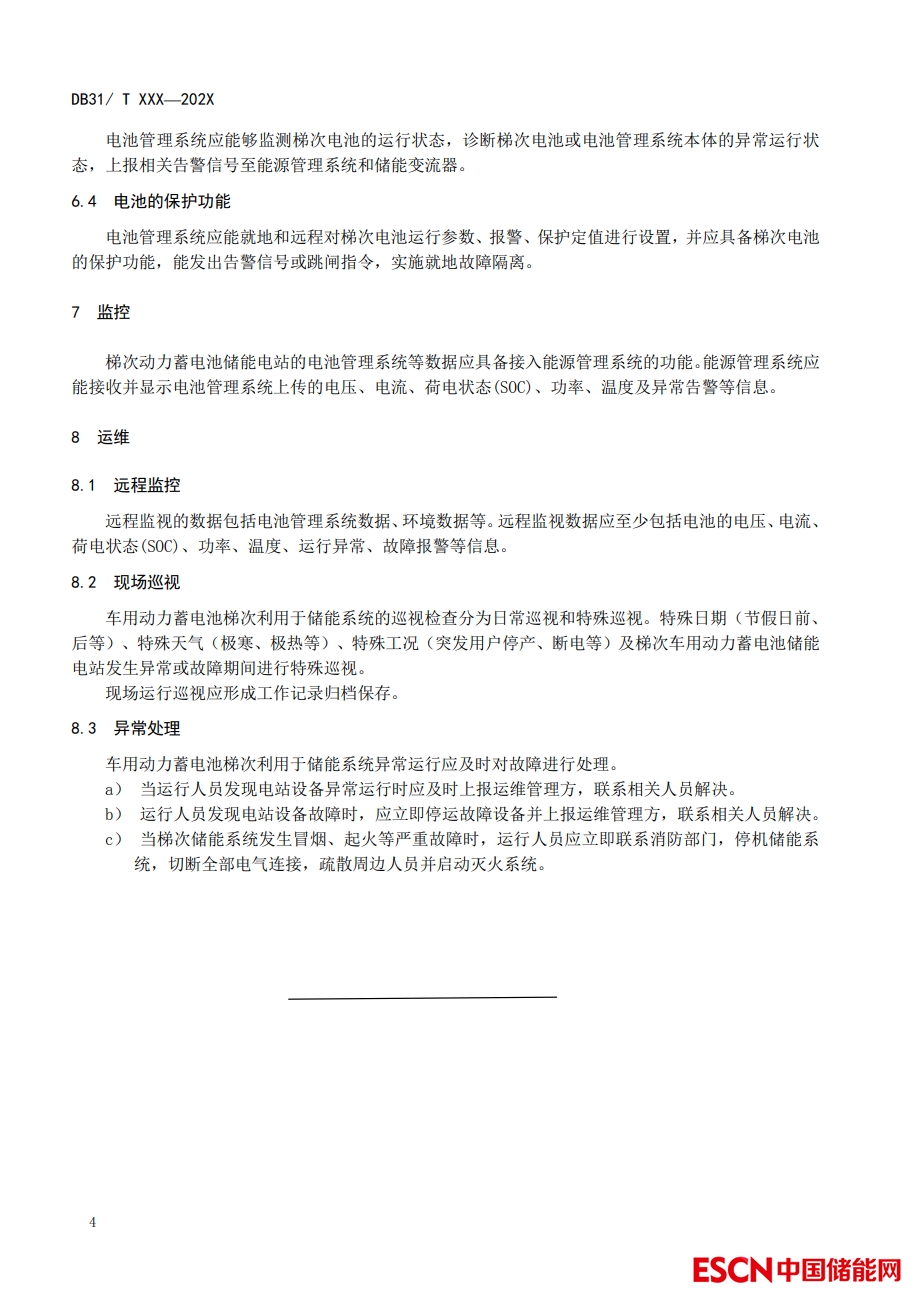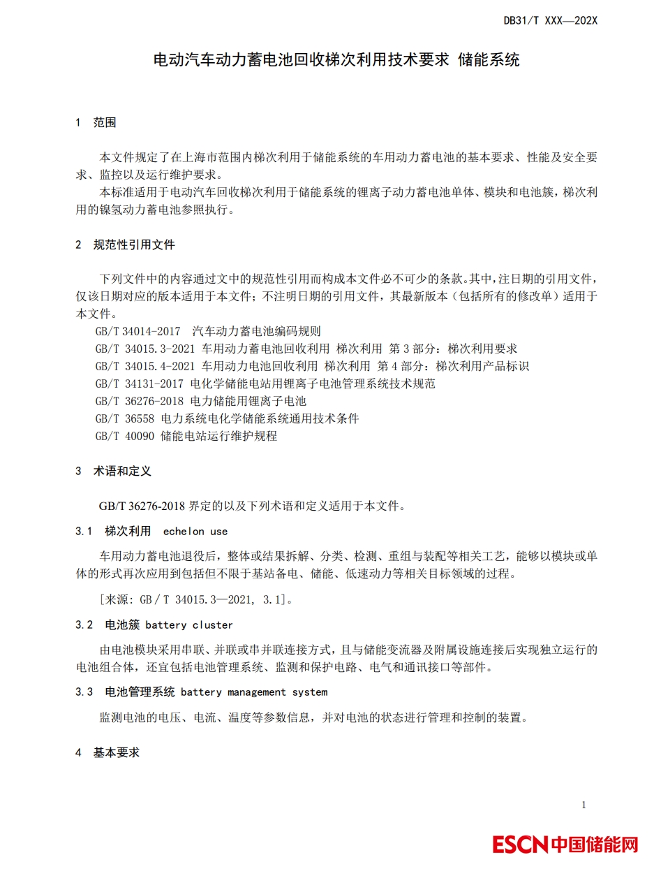 能及安全要求、監(jiān)控以及運(yùn)行維護(hù)要求。適用于電動(dòng)汽車回收梯次利用于儲(chǔ)能系統(tǒng)的鋰離子動(dòng)力蓄電池單體、模塊和電池簇,梯次利用的鎳氫動(dòng)力蓄電池參照?qǐng)?zhí)行。