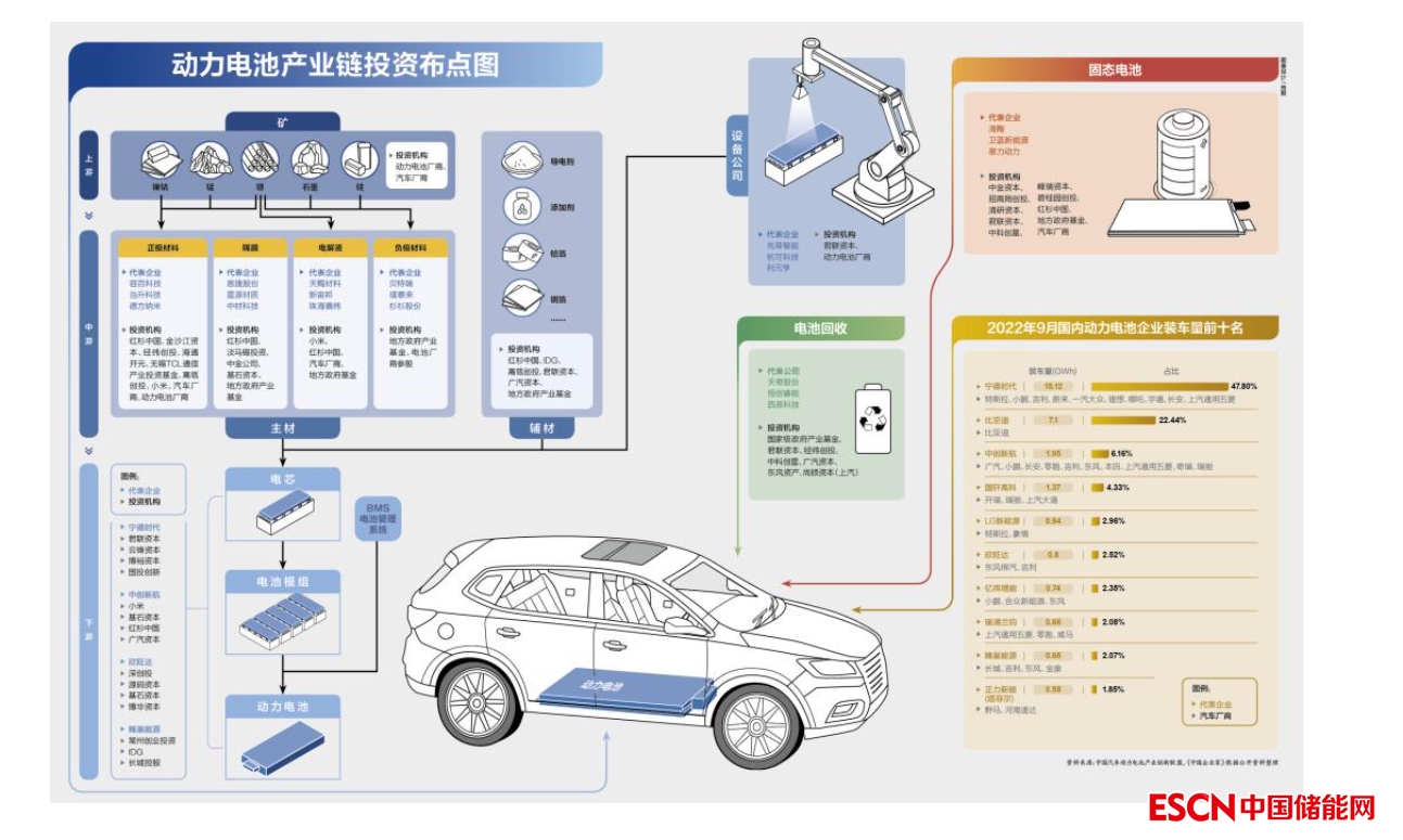 這個(gè)產(chǎn)業(yè)鏈在全球影響力也與日俱增,根據(jù)市場(chǎng)調(diào)研機(jī)構(gòu)SNE Research發(fā)布的數(shù)據(jù),2022年上半年全球動(dòng)力電池裝機(jī)量排名前十的企業(yè)中,中國(guó)企業(yè)就占6家,市場(chǎng)份額合計(jì)56.4%。廣汽資本對(duì)動(dòng)力電池上游材料供應(yīng)鏈的版圖梳理顯示,包括正極、負(fù)極、電解液、隔膜等主材,還有導(dǎo)電劑、銅箔等輔材在內(nèi),中國(guó)材料企業(yè)的市場(chǎng)占比達(dá)全球的80%。