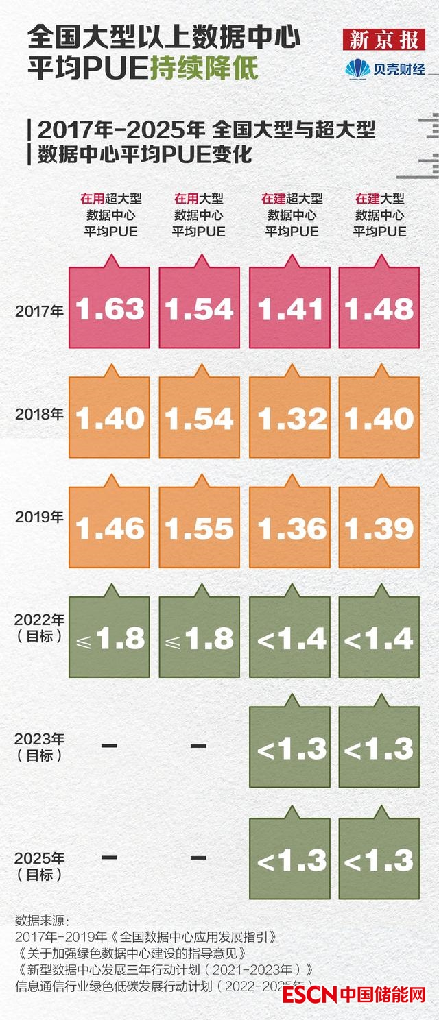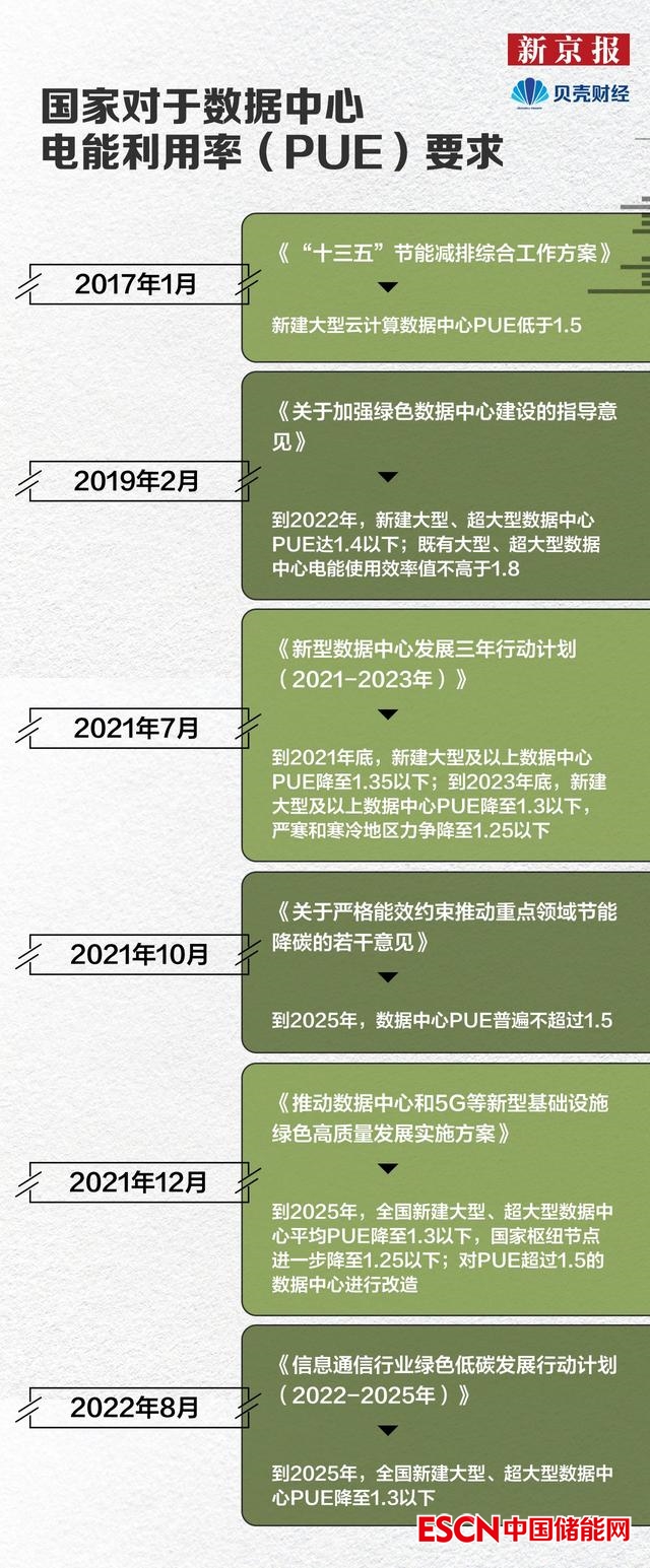 2017年,《“十三五”節(jié)能減排綜合工作方案》提出,新建大型云計算數(shù)據(jù)中心PUE值低于1.5。2021年12月,國家發(fā)改委四部門發(fā)布新政提出,到2025年,全國新建大型、超大型數(shù)據(jù)中心平均PUE值降至1.3以下,國家樞紐節(jié)點還將進(jìn)一步降至1.25以下。
