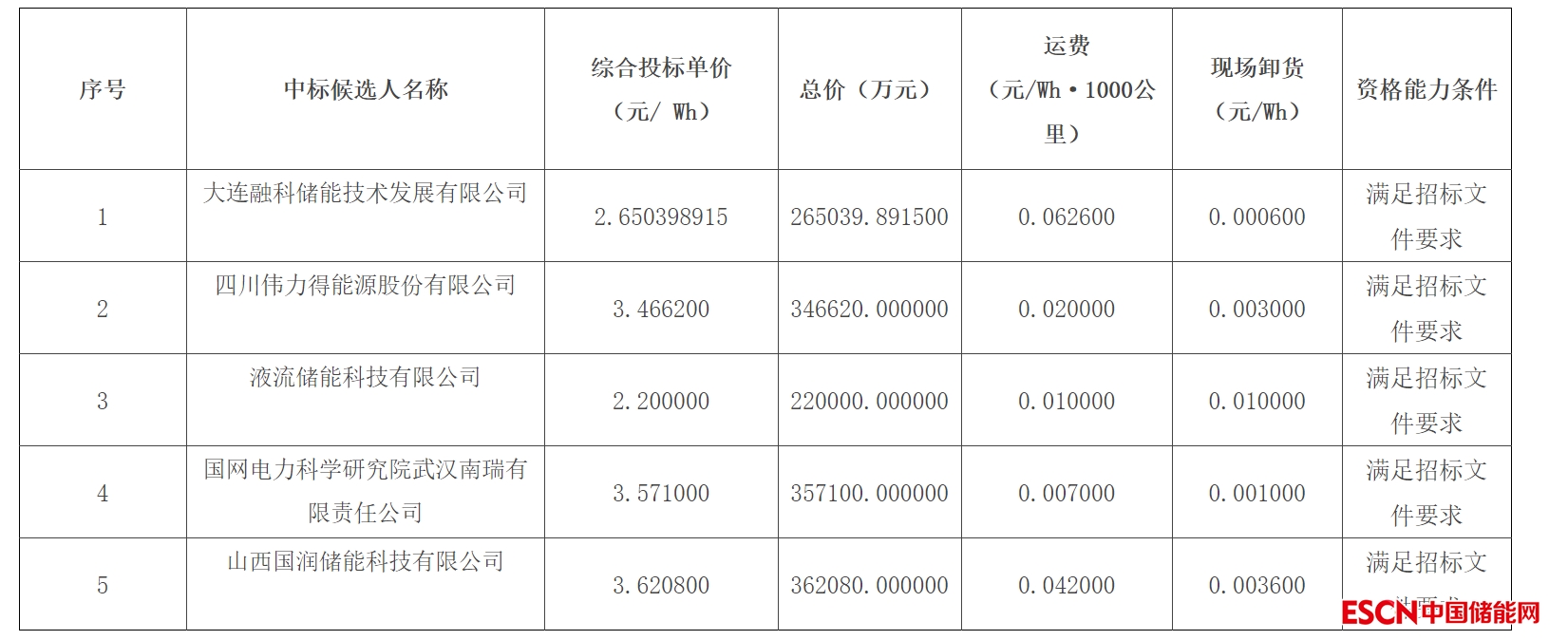 評標情況:本項目于2022年10月24日在北京市豐臺區(qū)首科大廈A座16層東區(qū)1610會議室進行了評標,共有四川偉力得能源股份有限公司、華秦儲能技術有限公司、液流儲能科技有限公司、大連融科儲能技術發(fā)展有限公司、國網(wǎng)電力科學研究院武漢南瑞有限責任公司、山西國潤儲能科技有限公司、大力電工襄陽股份有限公司、開封時代新能源科技有限公司、寰泰儲能科技股份有限公司、上海電氣(安徽)儲能科技有限公司共10家投標人按招標文件要求遞交了投標文件。經(jīng)過綜合評價,評標委員會一致推薦本次招標的中標候選人為:第一名大連融科儲能技術發(fā)展有限公司;第二名四川偉力得能源股份有限公司;第三名液流儲能科技有限公司;第四名國網(wǎng)電力科學研究院武漢南瑞有限責任公司;第五名山西國潤儲能科技有限公司。
