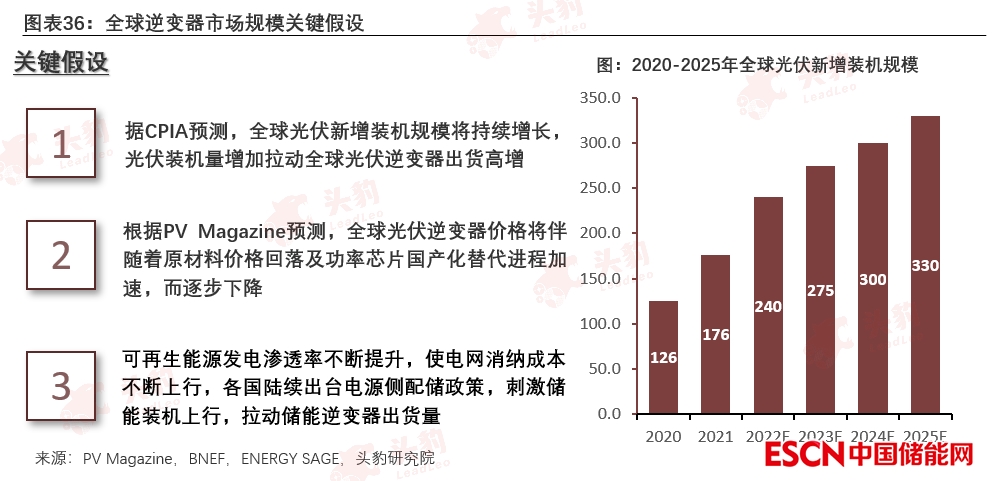 (3)儲(chǔ)能裝機(jī)需求爆發(fā):源網(wǎng)荷三側(cè)配儲(chǔ)出將拉動(dòng)光伏逆變器出貨。根據(jù)頭豹研究院測(cè)算,2025年全球逆變器市場(chǎng)規(guī)模將達(dá)到1,178億元,三年CAGR將達(dá)14.8%,儲(chǔ)能逆變器市場(chǎng)將是最具潛力的逆變細(xì)分賽道。