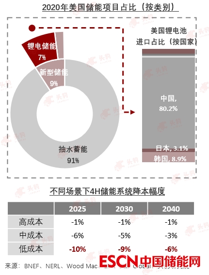 根據(jù)DoE的儲(chǔ)能項(xiàng)目數(shù)據(jù)庫(kù)顯示,2020年美國(guó)累計(jì)儲(chǔ)能裝機(jī)項(xiàng)目中,抽水蓄能裝機(jī)占比高達(dá)91%,主要系因其低成本及高安全性,是當(dāng)下各類型儲(chǔ)能項(xiàng)目中的最佳選擇。而鋰電儲(chǔ)能是新型儲(chǔ)能中的主導(dǎo)力量,占比近80%,主要受不斷下降的鋰電池成本推動(dòng)。但美國(guó)鋰電行業(yè)對(duì)海外進(jìn)口依賴較重,拆分其進(jìn)口數(shù)據(jù)可得,在其進(jìn)口鋰電池中,東亞三國(guó)對(duì)其出口占比高達(dá)92.2%。其中,中國(guó)占比達(dá)80.2%。故已推出系列法案來(lái)推動(dòng)本土鋰電產(chǎn)業(yè)發(fā)展,以擺脫對(duì)東亞三國(guó)鋰電進(jìn)口的高度依賴。