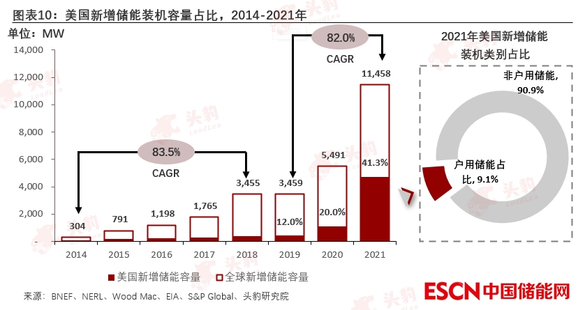 全球儲(chǔ)能裝機(jī)維持高速增長(zhǎng),美國(guó)儲(chǔ)能占比近三年大幅提升,成為全球儲(chǔ)能裝機(jī)高增的中堅(jiān)力量:2021年全球儲(chǔ)能新增裝機(jī)規(guī)模達(dá)到11,458MW,創(chuàng)新歷史新高,2019-2021年CAGR高達(dá)82%,與2014-2018年間的CAGR 83.5%基本持平,顯示出儲(chǔ)能行業(yè)在近十年間的發(fā)展韌性十足。