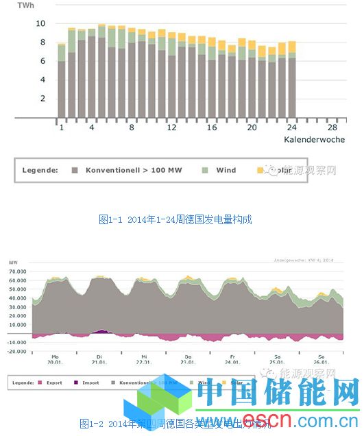 回答一:否。在能源資源枯竭預(yù)期、環(huán)境保護(hù)、應(yīng)對氣候變化等客觀約束下,擺脫化石能源依賴成為人們對未來能源圖景的最美好愿望,但實現(xiàn)遠(yuǎn)比愿望殘酷。由于光伏和風(fēng)電受天氣條件影響,發(fā)電出力具有間歇性和不穩(wěn)定性,用專業(yè)術(shù)語講,就是容量可信度(capacity credit)很低。以德國為例,2014年第1-24周(2013年12月30日-2014年6月15日)德國各類型發(fā)電量構(gòu)成如圖1-1所示??梢钥闯?,光伏電量在每一周里所占的比例差別非常大。尤其是在第四周(1月20-26日,如圖1-2),光伏最大瞬時出力僅為410萬千瓦,僅占光伏總裝機(jī)容量的11%。該周內(nèi)光伏發(fā)電量僅為8000萬千瓦時,相當(dāng)于每天光伏滿負(fù)荷運(yùn)行時間僅為18分鐘。在光伏、風(fēng)電均不給力的情況下,需要煤電、氣電、核電等常規(guī)電源頂上。