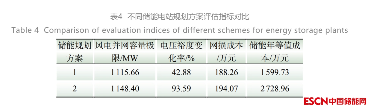 由表4中方案1可知,準(zhǔn)東地區(qū)最優(yōu)廣域儲(chǔ)能電站定容-選址一體規(guī)劃方案使系統(tǒng)風(fēng)電并網(wǎng)容量極限增加107.33 MW,風(fēng)電消納能力顯著提升。表4中方案2由于儲(chǔ)能電站并網(wǎng)容量更大,風(fēng)電并網(wǎng)容量極限提升效果更為明顯。然而,大量的儲(chǔ)能電站并網(wǎng)使系統(tǒng)靜態(tài)電壓穩(wěn)定受到嚴(yán)重影響,系統(tǒng)靜態(tài)電壓穩(wěn)定裕度變化率超過90%,且儲(chǔ)能成本相比于方案1增加了70.59%。相較之下,2種方案在網(wǎng)損方面差別不大。上述情況導(dǎo)致方案2的規(guī)劃效果遠(yuǎn)遜色于方案1。因此,進(jìn)行儲(chǔ)能電站規(guī)劃時(shí)直接將并網(wǎng)點(diǎn)選在風(fēng)電場處并非一定是理想的選擇,需要綜合考量多方面因素決定最終的規(guī)劃方案。