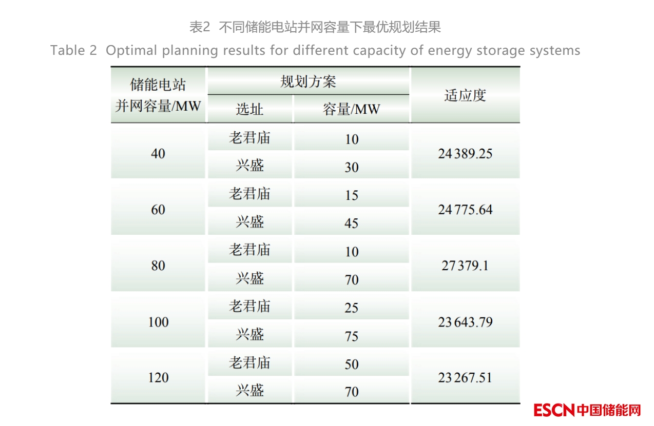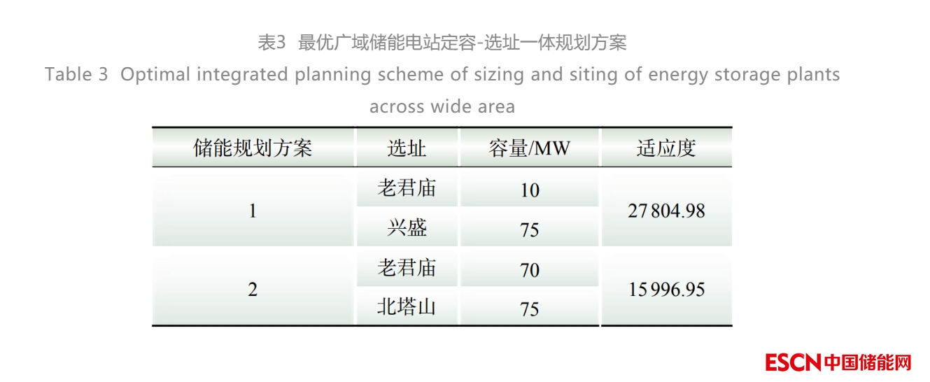 根據(jù)表2中不同儲(chǔ)能并網(wǎng)容量下的方案適應(yīng)度變化趨勢,進(jìn)一步探究準(zhǔn)東地區(qū)最優(yōu)廣域儲(chǔ)能電站選址-定容一體規(guī)劃方案,結(jié)果如表3所示。