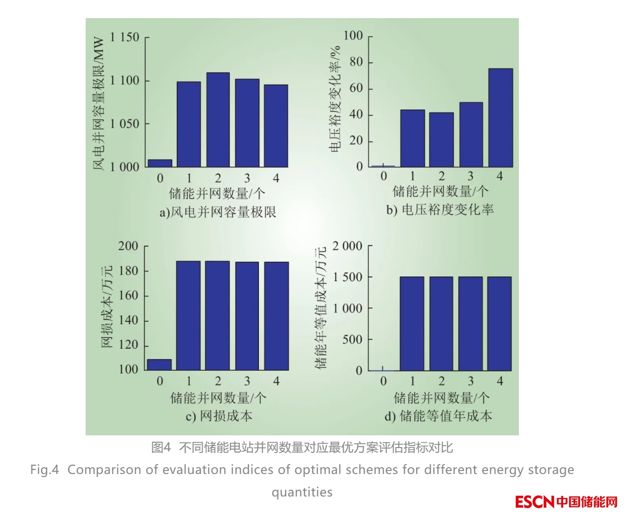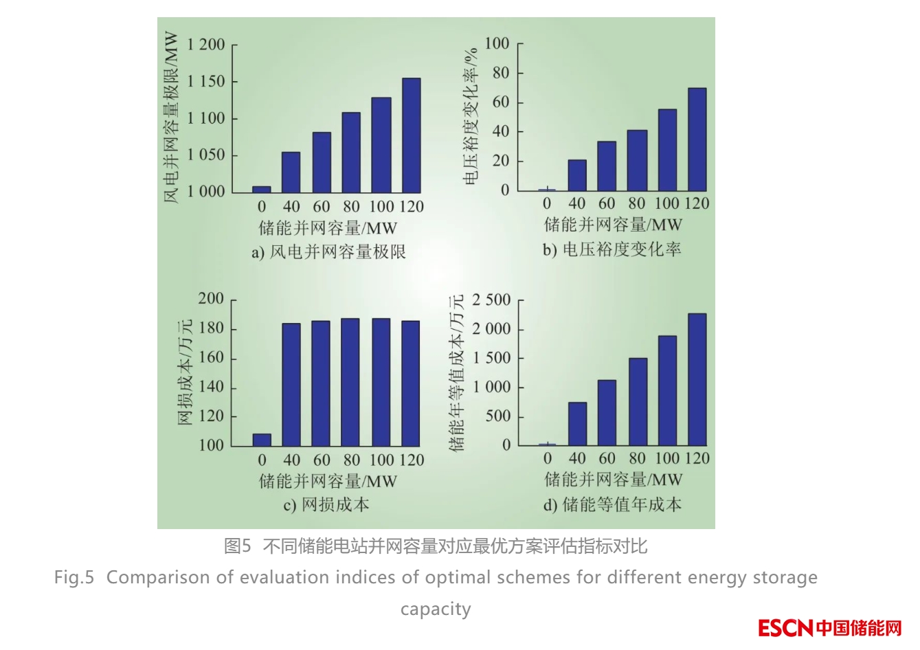 由圖5可知,儲(chǔ)能電站并網(wǎng)投運(yùn)使系統(tǒng)風(fēng)電并網(wǎng)容量極限上升明顯,風(fēng)電消納能力得到顯著提升,且隨著儲(chǔ)能電站并網(wǎng)容量的增加,提升幅度也隨之增大。然而,系統(tǒng)靜態(tài)電壓穩(wěn)定裕度變化率及年等值成本也隨之增加,相應(yīng)規(guī)劃方案在系統(tǒng)穩(wěn)定性及經(jīng)濟(jì)性層面均失去了優(yōu)勢。網(wǎng)損方面,不同儲(chǔ)能電站并網(wǎng)容量下的最優(yōu)方案對系統(tǒng)網(wǎng)損的影響相對較小。上述分析也對表2中的規(guī)劃結(jié)果做出了解釋,即當(dāng)儲(chǔ)能電站并網(wǎng)容量增長超出一定范圍后,其提升系統(tǒng)風(fēng)電消納能力所帶來的積極效應(yīng)將不足以再抵消因系統(tǒng)靜態(tài)電壓穩(wěn)定性下降及儲(chǔ)能成本增加而導(dǎo)致的不利影響。