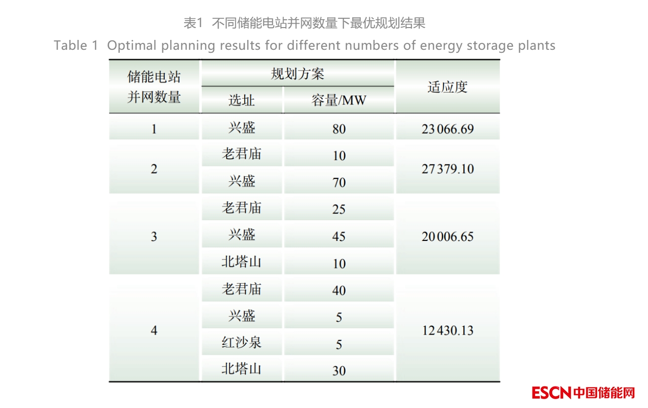 為滿足準(zhǔn)東地區(qū)廣域儲(chǔ)能電站多點(diǎn)規(guī)劃需求,本節(jié)探討當(dāng)儲(chǔ)能電站并網(wǎng)總?cè)萘恳欢〞r(shí),其并網(wǎng)數(shù)量對規(guī)劃結(jié)果的影響,將儲(chǔ)能電站并網(wǎng)總?cè)萘抗潭轱L(fēng)電裝機(jī)容量的20%,即80 MW。分別針對儲(chǔ)能電站并網(wǎng)數(shù)量為1~4時(shí)的定容-選址一體規(guī)劃方案進(jìn)行優(yōu)化,得到不同情況下最優(yōu)方案及其適應(yīng)度如表1所示。