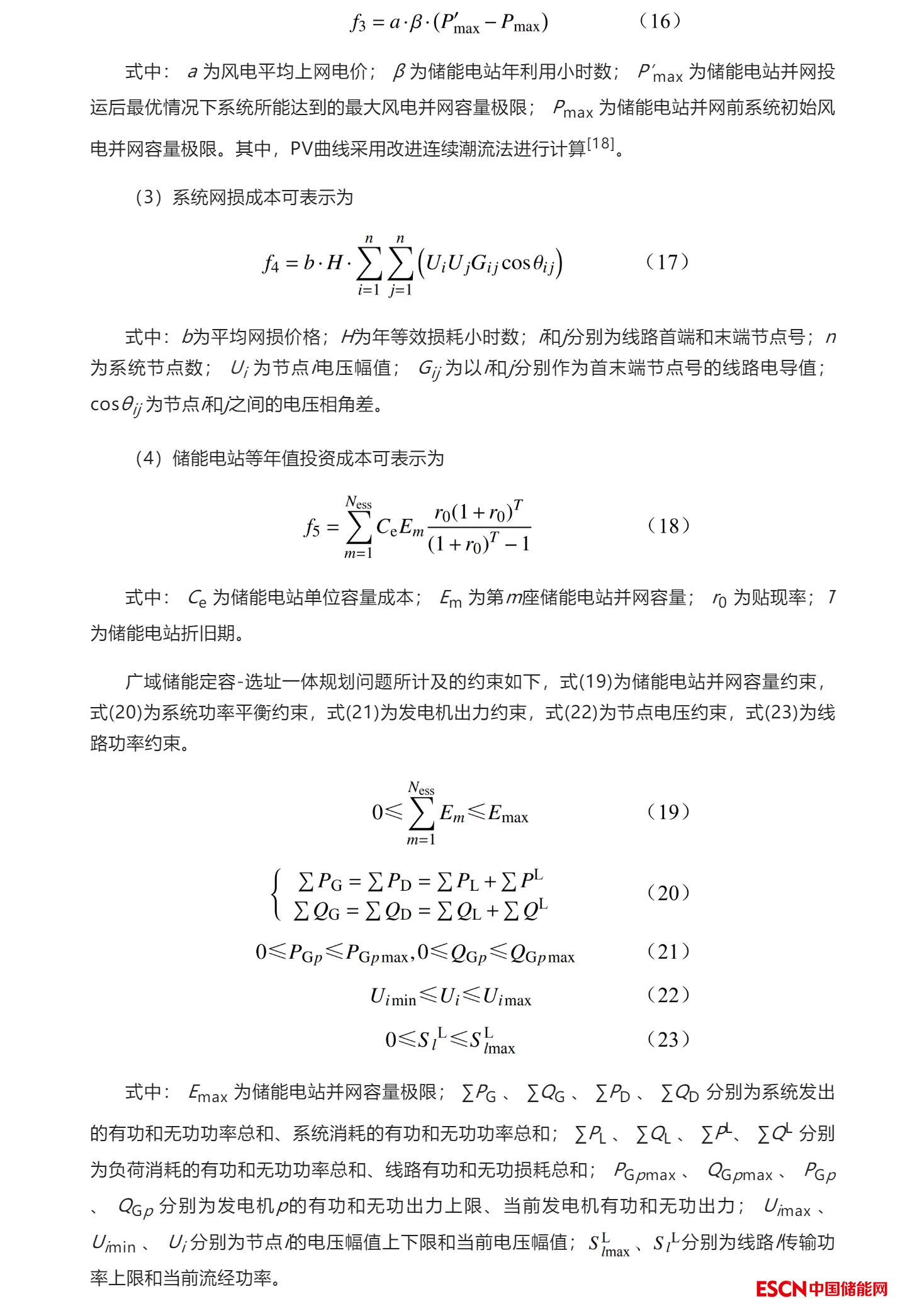 為避免儲(chǔ)能定容與選址規(guī)劃解耦研究可能帶來的不利影響,部分學(xué)者展開了儲(chǔ)能定容-選址一體規(guī)劃研究,采用優(yōu)化迭代算法進(jìn)行模型求解[10-14]。眾多技術(shù)性及經(jīng)濟(jì)性因素都將對儲(chǔ)能規(guī)劃結(jié)果產(chǎn)生影響[15]。技術(shù)性層面上,文獻(xiàn)[10]綜合考慮削峰填谷能力、電壓質(zhì)量及功率主動(dòng)調(diào)節(jié)能力,使用基于粒子群的帶權(quán)極小模理想點(diǎn)法求解模型。文獻(xiàn)[11]從系統(tǒng)電壓質(zhì)量及負(fù)荷波動(dòng)方面考慮,提出改進(jìn)多目標(biāo)粒子群算法(PSO)進(jìn)行模型求解。經(jīng)濟(jì)性層面上,部分學(xué)者從網(wǎng)損成本、年綜合費(fèi)用等方面展開研究[12-13],其中文獻(xiàn)[12]利用遺傳算法(GA)求解儲(chǔ)能規(guī)劃方案,文獻(xiàn)[13]采用嵌入潮流計(jì)算的雙層迭代混合PSO算法求解模型。此外,文獻(xiàn)[14]綜合考慮技術(shù)與經(jīng)濟(jì)因素,立足于電壓改善角度,構(gòu)建以投運(yùn)成本最小為目標(biāo)的儲(chǔ)能優(yōu)化規(guī)劃模型,采用GA算法求解。上述文獻(xiàn)從不同角度研究了儲(chǔ)能定容-選址一體規(guī)劃問題,有效提升了儲(chǔ)能系統(tǒng)投運(yùn)效益,但研究場景均集中于配電網(wǎng),缺少針對廣域大電網(wǎng)的研究。面向配電網(wǎng)或大電網(wǎng)開展儲(chǔ)能定容選址規(guī)劃研究時(shí),成本一般是兩者均需考慮的因素,但依舊存在某些應(yīng)用目標(biāo)方面的差異。配電網(wǎng)中新能源并網(wǎng)以分布式電源形式為主,儲(chǔ)能電站規(guī)劃時(shí)更多關(guān)注于用戶側(cè),無論是削峰填谷或以提高電壓質(zhì)量為應(yīng)用目標(biāo),均為改善負(fù)荷特性、平抑負(fù)荷波動(dòng)、提升用戶用電質(zhì)量[10-11]。此外,儲(chǔ)能應(yīng)用于配電網(wǎng)時(shí)賦予的功率主動(dòng)調(diào)節(jié)能力會(huì)受到自身容量小的限制,因此同樣是儲(chǔ)能電站在配電網(wǎng)展開定容選址規(guī)劃時(shí)的考慮因素之一[10]。針對大電網(wǎng)而言,并網(wǎng)新能源以大型新能源電站為主,儲(chǔ)能電站定容選址規(guī)劃時(shí)的關(guān)注重點(diǎn)將從用戶側(cè)轉(zhuǎn)為新能源發(fā)電側(cè)和輸電側(cè),如考慮系統(tǒng)可接納新能源并網(wǎng)容量極限等因素[16-19]。儲(chǔ)能電站在配電網(wǎng)和大電網(wǎng)做定容選址規(guī)劃時(shí)應(yīng)用目標(biāo)不同,會(huì)導(dǎo)致規(guī)劃建模等方面的差異,將面向配電網(wǎng)時(shí)的儲(chǔ)能電站規(guī)劃方法套用于大電網(wǎng)的研究,適用性不強(qiáng)。
