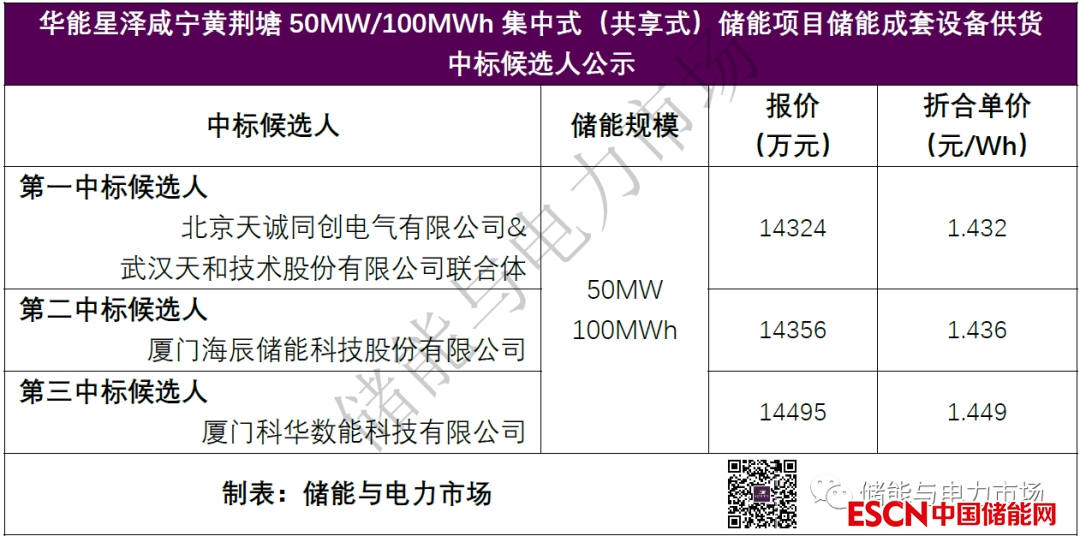 中國儲(chǔ)能網(wǎng)訊:近日,華能星澤咸寧黃荊塘50MW/100MWh集中式(共享式)儲(chǔ)能項(xiàng)目儲(chǔ)能成套設(shè)備供貨中標(biāo)候選人公示對外發(fā)布。北京天誠同創(chuàng)電氣有限公司&武漢天和技術(shù)股份有限公司聯(lián)合體以總報(bào)價(jià)14324萬元,折合單價(jià)1.432元/Wh,成為第一中標(biāo)候選人。