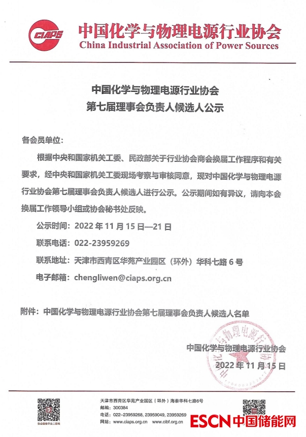 根據(jù)中央和國家機(jī)關(guān)工委、民政部關(guān)于行業(yè)協(xié)會商會換屆工作程序和有關(guān)要求,經(jīng)中央和國家機(jī)關(guān)工委現(xiàn)場考察與審核同意,現(xiàn)對中國化學(xué)與物理電源行業(yè)協(xié)會第七屆理事會負(fù)責(zé)人候選人進(jìn)行公示。公示期間如有異議,請向本會換屆工作領(lǐng)導(dǎo)小組或協(xié)會秘書處反映。