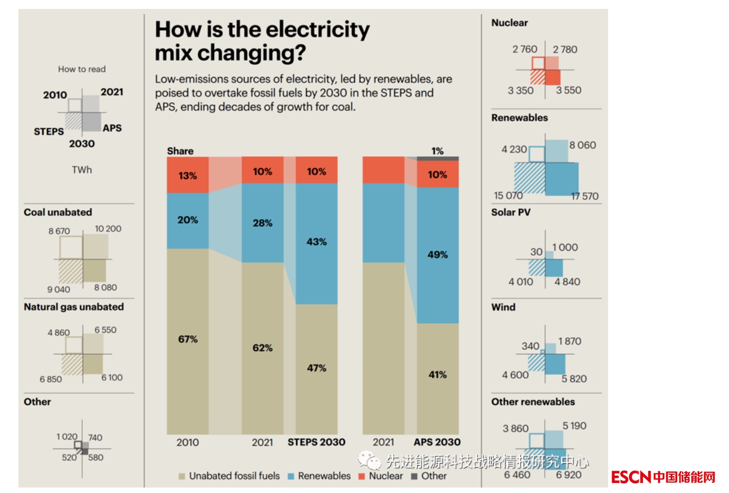 圖4 到2030年在既定政策情景和承諾目標(biāo)情景中以可再生能源為首的低排放電力占比有望超過(guò)化石燃料發(fā)電(單位:太瓦時(shí))