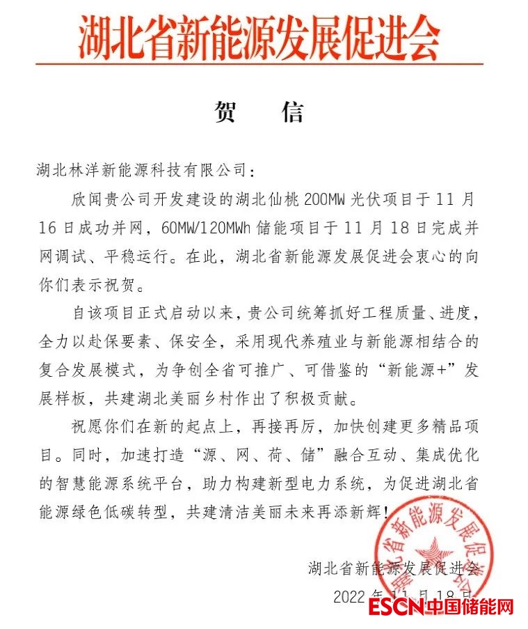項目并網后,湖北省新能源發(fā)展促進會第一時間發(fā)來賀信,充分肯定林洋項目對于湖北省新能源產業(yè)發(fā)展做出的積極貢獻!