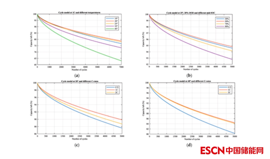 所示,模型顯示在不同運行工況條件下電池的壽命。電池在 10 °C 和 25 °C 下的循環(huán)性能較好,當(dāng)溫度升高,老化加速,循環(huán)次數(shù)減少。中 SOC 對電池循環(huán)性能也有影響,電池越接近 50% SOC淺充淺放對電池的壽命影響越小,同樣放電深度對電池也有影響。另外充放電倍率也有影響。