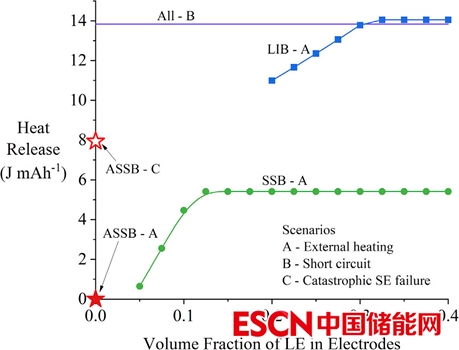 結(jié)論:研究人員分析了固態(tài)電池、全固態(tài)電池和液態(tài)電解質(zhì)鋰離子電池在極端情形下安全問題,盡管文章并未考慮在高溫下固態(tài)電解質(zhì)與負(fù)極(如金屬鋰)的反應(yīng),但也較為充分的說明與常規(guī)鋰離子電池相比,高能量密度全固態(tài)電池和添加少量液態(tài)電解質(zhì)的固態(tài)電池可能沒有安全優(yōu)勢。