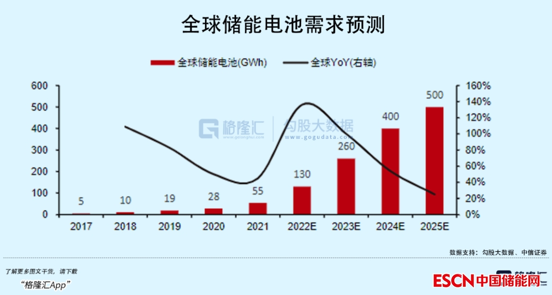 根據(jù)中信證券預(yù)測,2025年全球儲能電池需求將達到500GWh。儲能電池在能量密度上要求不如車用電池,其實能夠很好的承接一些相對遜色的電池產(chǎn)能。動力電池擴產(chǎn)規(guī)劃里,用于儲能的電池雖占據(jù)一小部分產(chǎn)能,但本質(zhì)都是鋰電池,不排除電池企業(yè)會根據(jù)需求程度調(diào)整方向的可能。