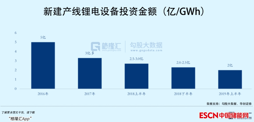 其次,近幾年鋰電池產(chǎn)線設(shè)備價格的下降,也令到整個行業(yè)準入門檻有了一些降低,規(guī)模效應(yīng)疊加設(shè)備零部件國產(chǎn)化導(dǎo)致鋰電設(shè)備成本大幅下降,目前國內(nèi)鋰電池產(chǎn)線單GWh產(chǎn)能投資價格已從原來的10億元左右降至2.4億元以下,降幅非常明顯。