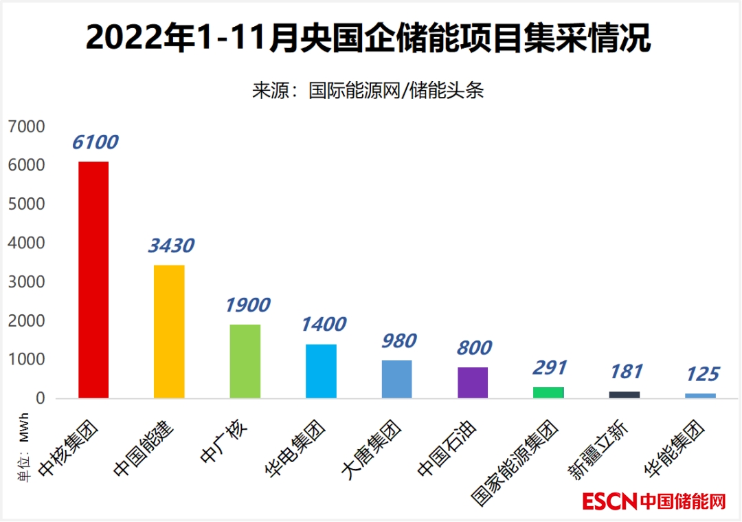 其中,中核集團(tuán)、中國(guó)能建、中廣核、華電集團(tuán)均開啟了GWh級(jí)的儲(chǔ)能招標(biāo)項(xiàng)目。其中尤以中核匯能最為大手筆,采購6.1GWh儲(chǔ)能系統(tǒng)。