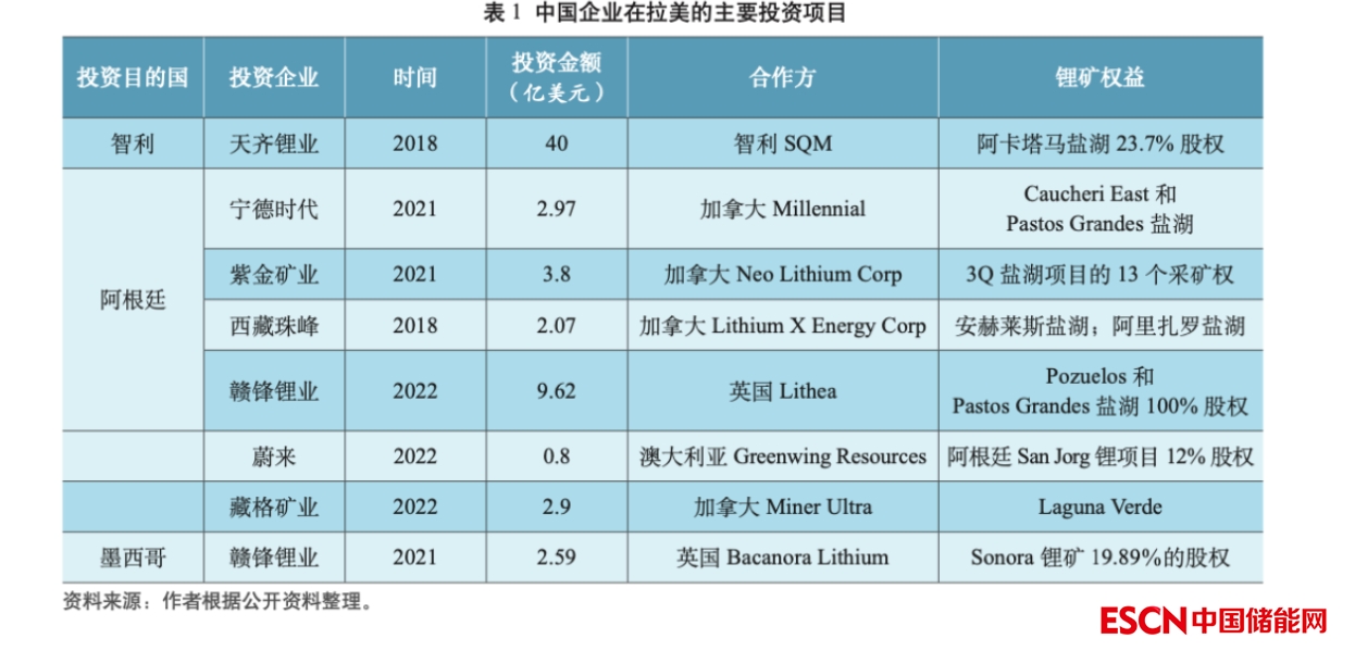 據(jù)美國《地緣政治監(jiān)測》網(wǎng)報道,從 2018年到2020年,中國在南美鋰三角的采礦項目投資約160億美元。中國對拉美鋰礦投資形式多為股權(quán)并購,投資目的國主要集中在智利、阿根廷和墨西哥。2018 年天齊鋰業(yè)以 40 億美元收購了智利鋰礦企業(yè),智利礦業(yè)化工(SQM)23.7%的股份,是近年中企最大的一筆鋰礦投資。阿根廷是投資項目和投資額最多的國家。由于受玻利維亞國內(nèi)因素的制約,中國對玻利維亞鋰礦投資進展緩慢。2022 年末,玻利維亞將舉行首次鋰礦開采的公私合作招標,有 4 家中國公司入圍。表 1 是中國在拉美的主要鋰礦投資項目情況。