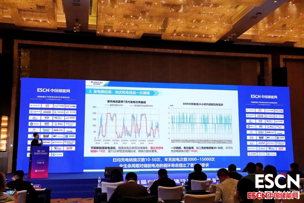 介紹完我司的系列產(chǎn)品,接下來介紹我司產(chǎn)品在各種領(lǐng)域的應(yīng)用。第一個是在發(fā)電側(cè)新能源場站的一次調(diào)頻。新能源的快速發(fā)展給電網(wǎng)業(yè)帶來了一個極大的挑戰(zhàn),各地也陸續(xù)出臺政策,要求新能源具備一次調(diào)頻功能,與此同時,各種標準陸續(xù)地出臺。新能源廠站的調(diào)頻功率需求是分鐘級、MW級,需求配置大功率的儲能,即我們的虛擬同步發(fā)電技術(shù)(VSG)。現(xiàn)階段存在的問題是,單一形式的儲能是無法解決功率密度和能量密度的矛盾。行業(yè)上現(xiàn)在比較常見的做法,就是用這種混合型儲能,比如說鉛酸電池加超級電容器,或者磷酸電池加飛能的混合形式,這種混合儲能也面臨著一個問題,配置比例以及協(xié)調(diào)控制的難度較大;另外隨著光伏子陣和風(fēng)力發(fā)電機的單機的規(guī)模也不斷增大的,對于這種高成本的功率型儲能配比和能量型全生命周期的循環(huán)壽命,也是提出了一個更高的要求。這對混合型儲能經(jīng)濟性和性價比也是一個非常大的考驗。