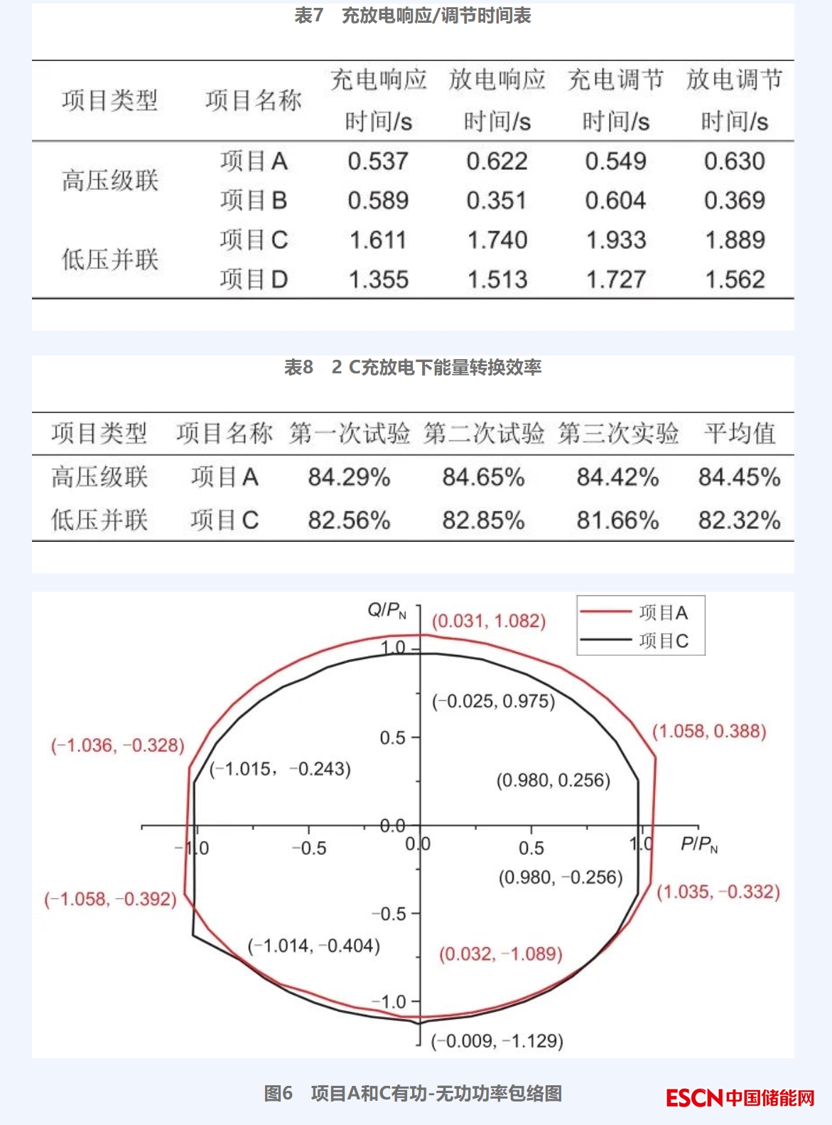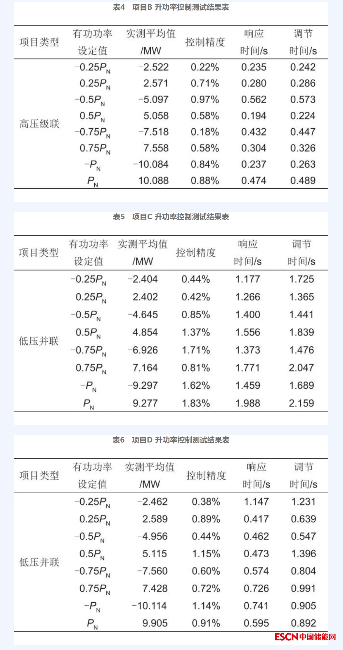 對4個項目進(jìn)行有功功率控制測試,選取升功率結(jié)果進(jìn)行分析,通過表3~表6的對比,總體上看,在有功控制性能測試方面,項目A、B的控制精度均值分別為0.51%和0.62%、響應(yīng)時間的均值分別為0.578 s和0.340 s、調(diào)節(jié)時間均值分別為0.625 s和0.356 s;項目C和項目D的控制精度均值分別為1.13%和0.78%、響應(yīng)時間的均值分別為1.499 s和0.642 s、調(diào)節(jié)時間均值分別為1.718 s和0.926 s;可以看出,高壓級聯(lián)儲能系統(tǒng)對功率的控制精度及控制時間較優(yōu)于低壓并聯(lián)儲能系統(tǒng)。在低壓并聯(lián)儲能系統(tǒng)中,以5 MW儲能單元為例,儲能管理系統(tǒng)在接收到指令后需要將指令下發(fā)到儲能單元,每個儲能單元通過8臺PCS控制電池出力,完成相應(yīng)指令。而在高壓級聯(lián)儲能系統(tǒng)中,儲能單元只需要通過控制1臺PCS便可完成對電池的控制,因此縮短了響應(yīng)時間和調(diào)節(jié)時間。