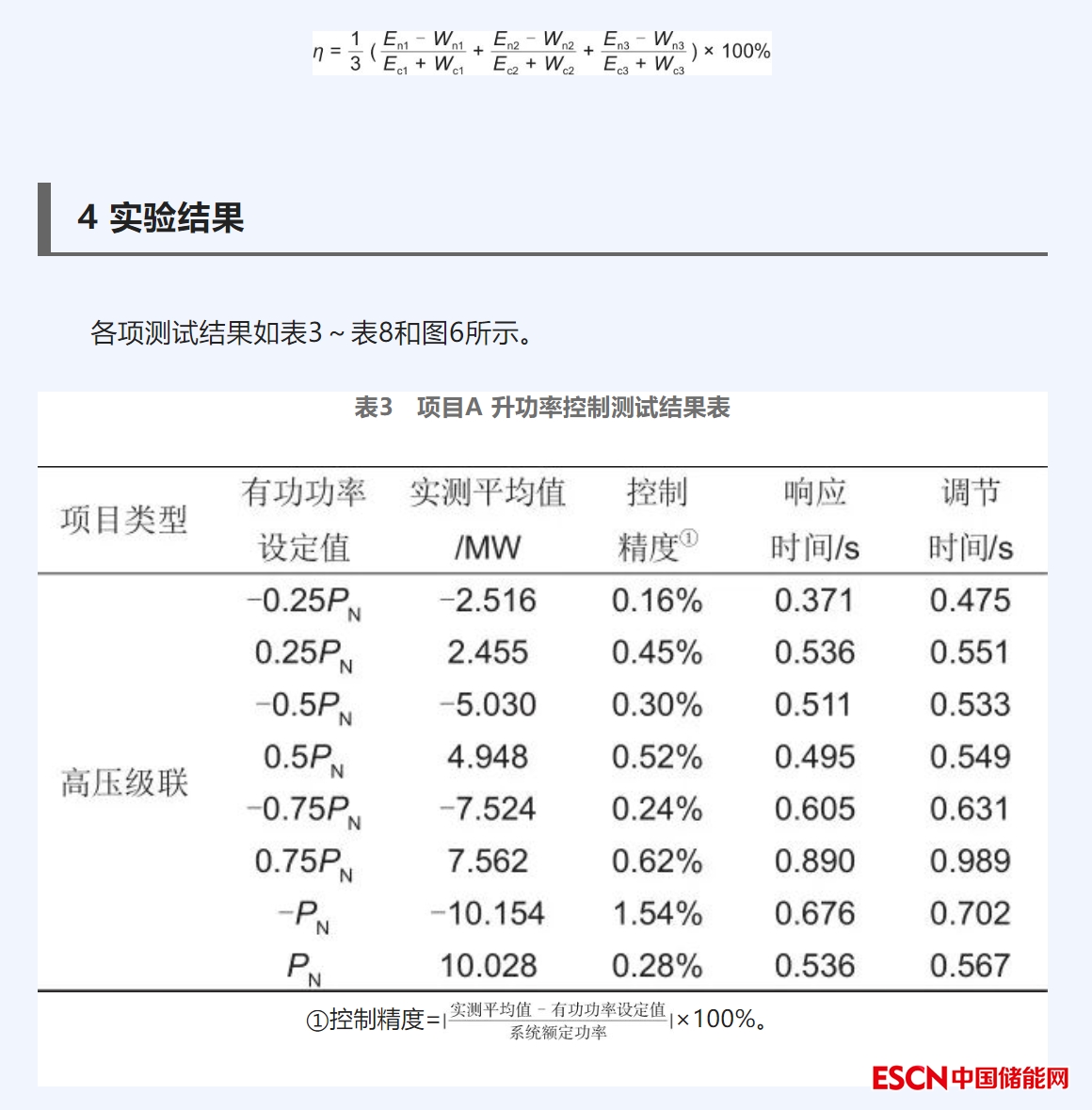 (2)在額定功率充放電條件下,記錄儲能系統(tǒng)收到控制信號的時刻t3,記錄儲能充/放電功率的偏差維持在額定功率±2%以內(nèi)的起始時刻,記為t4,t4減去t3即為充/放電調(diào)節(jié)時間ATc,重復(fù)3次,充/放電調(diào)節(jié)時間取3次結(jié)果中的最大值。