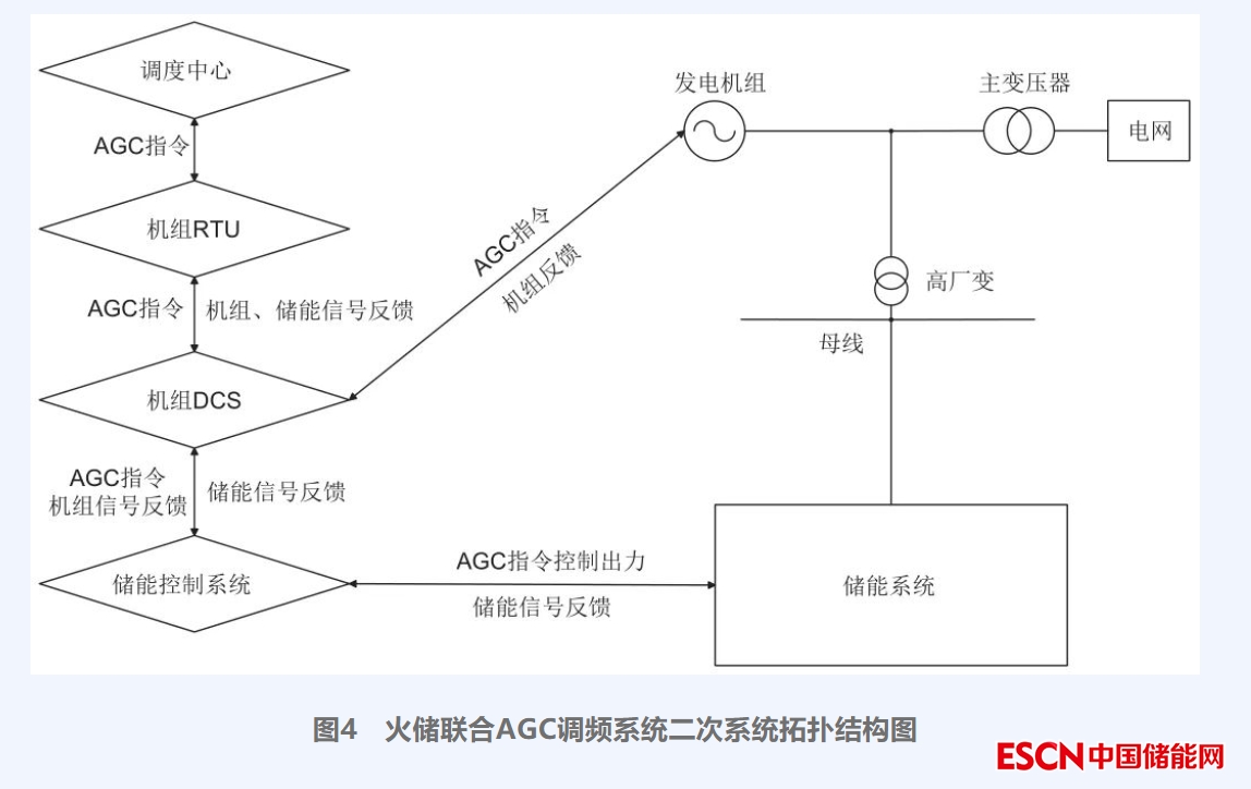 在機(jī)組投入AGC模式下,調(diào)度向機(jī)組遠(yuǎn)程終端單元(remote terminal unit,RTU)發(fā)送AGC調(diào)頻指令,RTU接收指令后,迅速將信號傳遞至機(jī)組分散控制系統(tǒng)(distributed control system,DCS),DCS控制機(jī)組向目標(biāo)值出力,同時將信號傳送至儲能控制系統(tǒng)。儲能控制系統(tǒng)根據(jù)調(diào)頻機(jī)組實(shí)時負(fù)荷與AGC指令目標(biāo)負(fù)荷之間的差值,控制儲能單元出力大小彌補(bǔ)差值,并向RTU和DCS反饋相應(yīng)信號,RTU接收儲能和機(jī)組的反饋信號后,整合機(jī)組和儲能的出力情況并向相關(guān)數(shù)據(jù)上送調(diào)度,完成一個調(diào)頻周期?;饍β?lián)合調(diào)頻系統(tǒng)的控制邏輯拓?fù)浣Y(jié)構(gòu)圖如圖4所示。