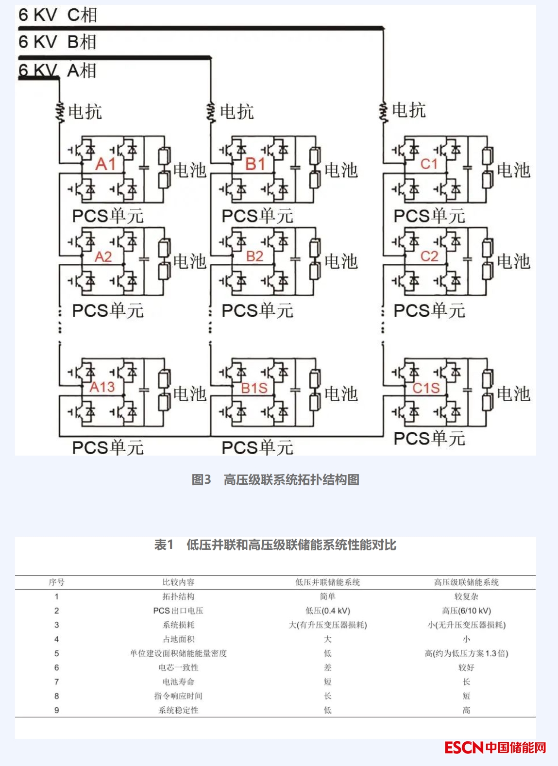 在高壓級聯(lián)儲能單元中,級聯(lián)儲能PCS的每個H橋單元由一個電池組和與之并聯(lián)的濾波電容及H橋逆變電路組成,輸出相電壓電平m=2N+1(N為功率變換單元數(shù)),輸出線電壓為4N+1電平;隨著功率變換單元的增加,會使得并網(wǎng)電流波形更加平滑。多個H橋單元交流側(cè)串聯(lián)作為級聯(lián)儲能PCS的一相,三相采用星形接線方式。相較于低壓并聯(lián),高壓級聯(lián)系統(tǒng)拓?fù)浣Y(jié)構(gòu)較為復(fù)雜,如圖3所示。低壓并聯(lián)和高壓級聯(lián)儲能系統(tǒng)性能對比如表1所示,高壓級聯(lián)儲能系統(tǒng)能夠直接輸出6 kV/10 kV,無需經(jīng)過變壓器,不僅減小系統(tǒng)損耗,提高效率,還減少了儲能系統(tǒng)的占地面積,降低了土地建設(shè)施工成本,提高了單位建設(shè)面積的能量密度。此外,在這種拓?fù)浣Y(jié)構(gòu)下,儲能系統(tǒng)能夠最大限度地減少或消除電池簇的并聯(lián)情況,使得各個電池簇之間相互獨(dú)立,減少或消除電池單體和電池簇的環(huán)流現(xiàn)象,削弱了儲能系統(tǒng)中電池一致性導(dǎo)致的問題,提高電池系統(tǒng)的循環(huán)壽命、降低了生產(chǎn)運(yùn)行的安全風(fēng)險。高壓級聯(lián)儲能系統(tǒng)每三相為一組控制單元,儲能系統(tǒng)不需要根據(jù)并聯(lián)儲能單元性能的差異進(jìn)行協(xié)調(diào)后再響應(yīng)指令,縮短了儲能系統(tǒng)的響應(yīng)時間。高壓級聯(lián)的拓?fù)浣Y(jié)構(gòu)在低壓直流側(cè)可以減少開關(guān)損耗,進(jìn)一步提高系統(tǒng)效率;而且低壓側(cè)的電子元件所需電流及高壓側(cè)的電力元件所需耐壓等級均明顯降低,有利于提高系統(tǒng)的穩(wěn)定性。