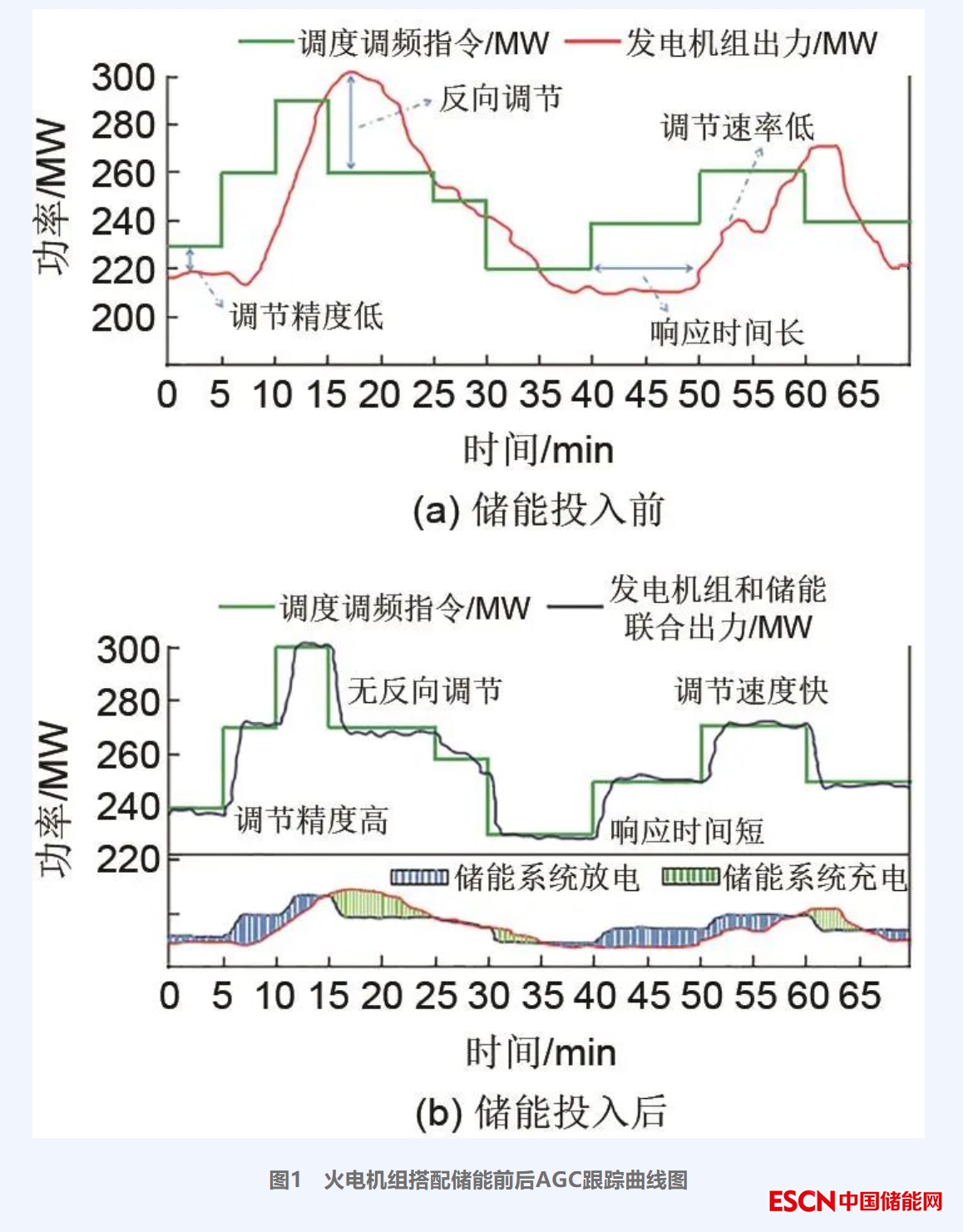 “雙碳”目標(biāo)下,由于能源的生產(chǎn)、消費(fèi)和利用呈現(xiàn)新的發(fā)展趨勢,在此趨勢下電力系統(tǒng)的電源結(jié)構(gòu)、負(fù)荷特性、電網(wǎng)形態(tài)、技術(shù)基礎(chǔ)及運(yùn)行特性將發(fā)生深刻變化,構(gòu)建新型電力系統(tǒng)將面臨電力電量平衡、系統(tǒng)安全穩(wěn)定、新能源高效利用等挑戰(zhàn)。由于新能源發(fā)電具有波動性及不確定性,會影響電網(wǎng)運(yùn)行的穩(wěn)定性,為了保障電網(wǎng)安全穩(wěn)定運(yùn)行,電力系統(tǒng)需要更多的靈活調(diào)頻資源來提升自身調(diào)節(jié)能力?;痣姍C(jī)組作為我國重要的發(fā)電載體承擔(dān)著主要的調(diào)頻工作?;痣姍C(jī)組的自動發(fā)電控制(automatic generation control,AGC)響應(yīng)時間長、功率爬坡速度慢、穩(wěn)態(tài)精度低,無法滿足當(dāng)前的調(diào)頻需求。電化學(xué)儲能系統(tǒng)具有調(diào)節(jié)速率快、響應(yīng)時間短、調(diào)節(jié)精度高等優(yōu)點(diǎn),屬于優(yōu)質(zhì)的調(diào)頻資源,能夠有效彌補(bǔ)火電機(jī)組調(diào)頻性能的不足。圖1為某火電廠增加電池儲能系統(tǒng)前后AGC跟蹤曲線,增加儲能系統(tǒng)后,火電機(jī)組能有效提高發(fā)電單元的調(diào)節(jié)速率、縮短響應(yīng)時間、提高調(diào)節(jié)精度,提升綜合調(diào)頻性能,配合電力調(diào)度機(jī)構(gòu)改善電網(wǎng)的頻率波動,緩解電網(wǎng)調(diào)頻資源特別是優(yōu)質(zhì)調(diào)頻資源不足的問題。為了進(jìn)一步加強(qiáng)電化學(xué)儲能電站安全管理,國家能源局發(fā)布了《關(guān)于加強(qiáng)電化學(xué)儲能電站安全管理的通知》,由于電化學(xué)儲能系統(tǒng)并網(wǎng)后,其功率調(diào)節(jié)響應(yīng)、充放電的規(guī)律和保護(hù)功能等都會對機(jī)組和廠用電設(shè)備的可靠運(yùn)行產(chǎn)生影響。此外許多儲能項目還存在簡單的堆砌現(xiàn)象,導(dǎo)致許多儲能輔助調(diào)頻項目存在能量效率不高、綜合調(diào)頻性能提升不明顯等問題。因此,為了保障儲能系統(tǒng)、機(jī)組及廠用電負(fù)荷的安全運(yùn)行,降低生產(chǎn)運(yùn)行風(fēng)險,電化學(xué)儲能調(diào)頻系統(tǒng)在并網(wǎng)前開展規(guī)范全面的并網(wǎng)檢測具有重要意義。