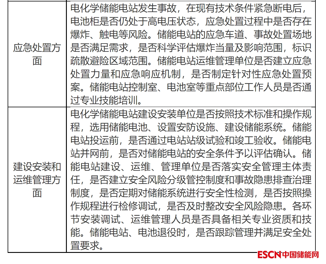電池本身安全風(fēng)險隱患、電池管理系統(tǒng)安全風(fēng)險隱患、儲能系統(tǒng)安全風(fēng)險隱患、儲能場所安全風(fēng)險隱患、安防設(shè)施風(fēng)險隱患、應(yīng)急處置風(fēng)險隱患、建設(shè)安裝和運維管理風(fēng)險隱患等。(詳見檢查評估細則)
