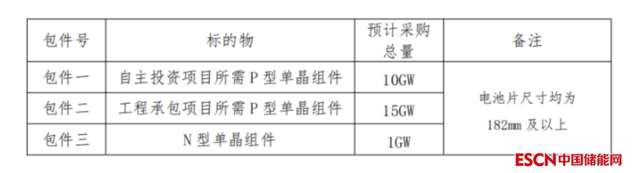 組件方面:本次招標分為3個包件進行投標,其中包括自主投資項目所需P型單晶組件10GW、工程承包項目所需P型組件15GW、以及N型單晶組件1GW。電池片尺寸均要求182mm及以上。潛在投標人可以對某一包件或全部包件進行投標,各包件組成詳見下表: