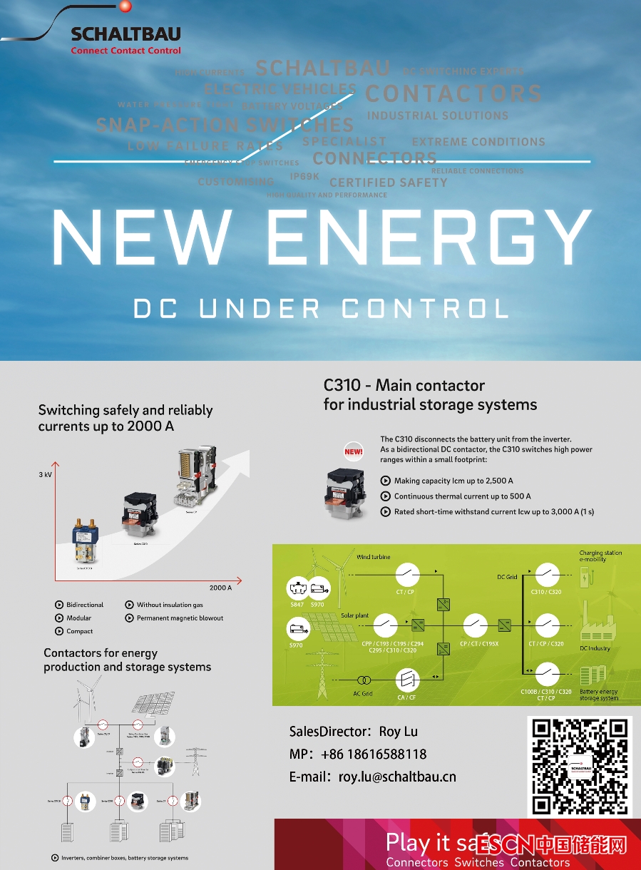 沙爾特寶針對儲能市場推出C300系列專用高壓直流接觸器,該系列接觸器可在1500V/500A的系統(tǒng)中輕松使用。