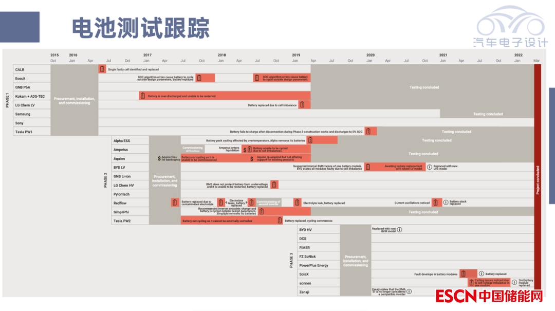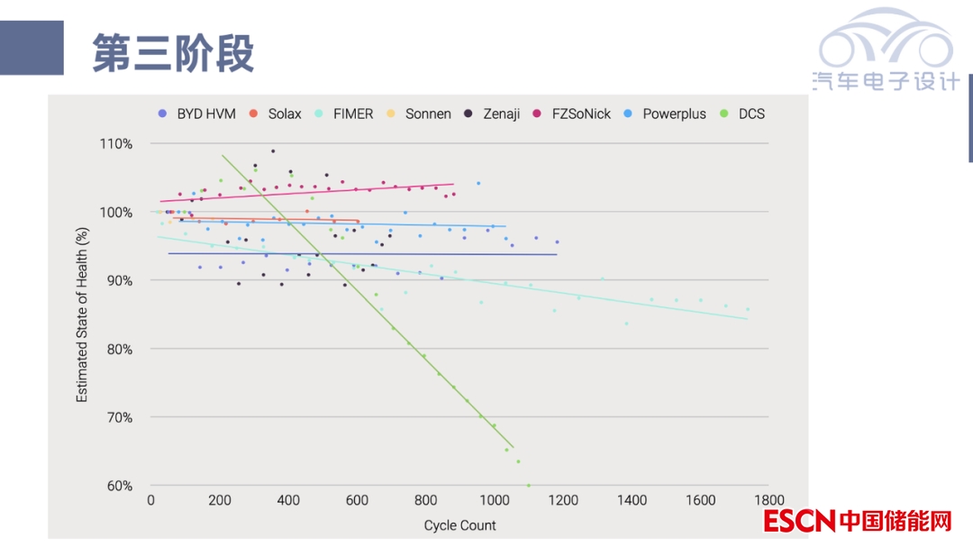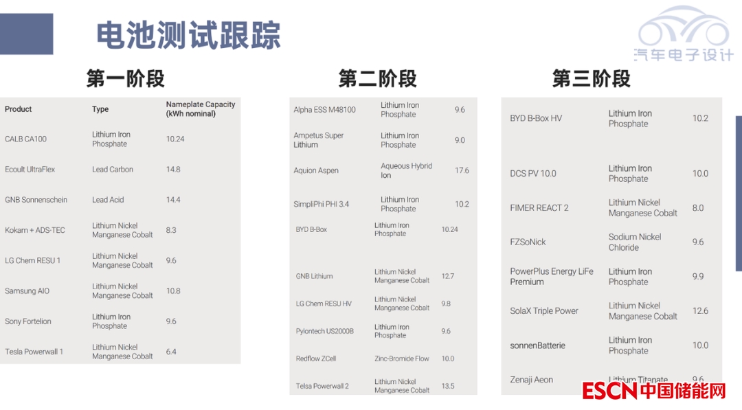 圖2是三個階段所測試的電池,這里注意沒有有鉛酸電池(被證明儲能領域不能用);主要是圍繞三元和LFP這塊——由于循環(huán)壽命特性,LFP效果很好;而FZSoNick的鈉離子電池產品也很受人關注。