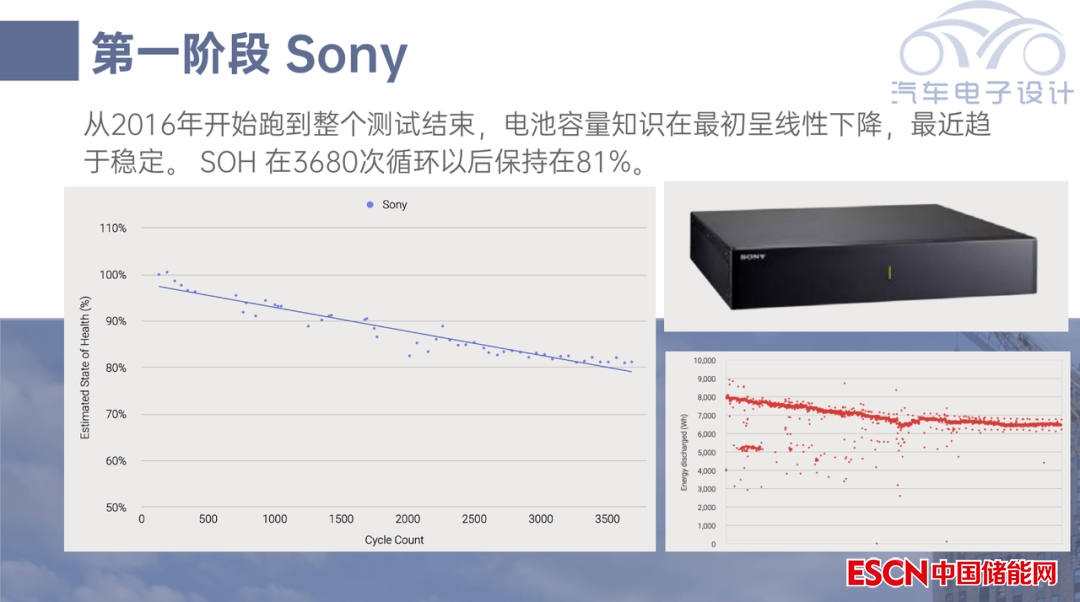 索尼的儲能電池在幾家里面順利跑了下來,從2016年開始跑到整個測試結束,電池容量在最初呈線性下降,最近趨于穩(wěn)定。SOH 在3680次循環(huán)以后保持在81%, 2500個循環(huán)保持在83%,也就是后面1000個循環(huán)只下降了2%。