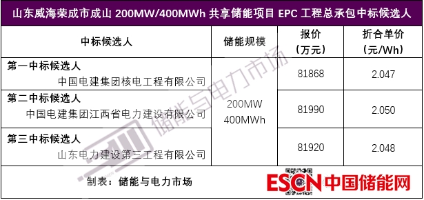 中國儲能網(wǎng)訊:近日,山東威海榮成市成山200MW/400MWh共享儲能項目EPC工程總承包中標候選人對外發(fā)布。中國電建集團核電工程有限公司以總報價81868萬元,折合單價2.047元/Wh,成為第一中標候選人。
