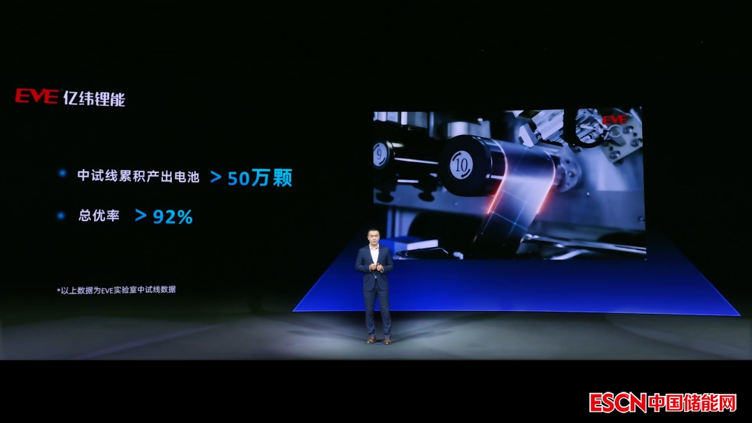 動(dòng)力電池研究院圓柱電池研究所所長徐悅斌,發(fā)布新一代大圓柱電池的研發(fā)樣品:能量密度350Wh/kg,可實(shí)現(xiàn)9分鐘超快充。在電池性能再創(chuàng)新高的同時(shí),由億緯鋰能自主研發(fā)的大圓柱中試線,已累計(jì)制樣超50萬顆,整體優(yōu)率達(dá)到92%。