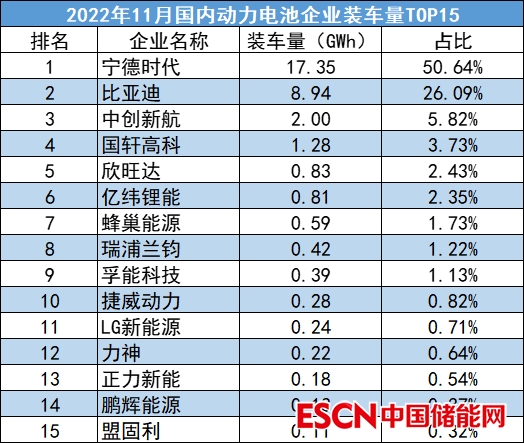 從廠商排名來看,寧德時代繼續(xù)穩(wěn)居市占率第一,11月單月裝機量達17.35吉瓦時,市占率為50.64%,時隔7個月再度占據(jù)國內(nèi)一半以上的市場份額,并創(chuàng)年內(nèi)新高。比亞迪緊隨其后,以8.94吉瓦時的裝車量和26.09%的市占率位列第二。中創(chuàng)新航、國軒高科、欣旺達則分別以5.82%、3.73%和2.43%的市占率,分列第三位、第四位和第五位。