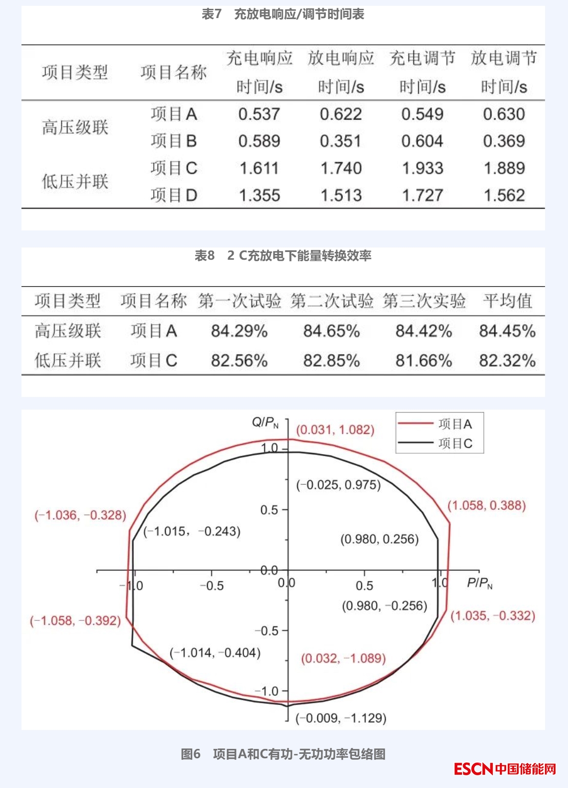 對(duì)4個(gè)項(xiàng)目進(jìn)行充放電響應(yīng)及調(diào)節(jié)時(shí)間測(cè)試,根據(jù)表7可得,配置了高壓級(jí)聯(lián)儲(chǔ)能系統(tǒng)的項(xiàng)目A和項(xiàng)目B的充放電響應(yīng)時(shí)間均明顯優(yōu)于配置了低壓并聯(lián)儲(chǔ)能系統(tǒng)的項(xiàng)目C和D。這是由于為了達(dá)到高電壓及大容量的需求,低壓并聯(lián)儲(chǔ)能系統(tǒng)需要采用更多的PCS等器件串并聯(lián),以10 MW左右的這4個(gè)儲(chǔ)能項(xiàng)目為例,高壓級(jí)聯(lián)系統(tǒng)只需要控制2臺(tái)5 MW PCS同時(shí)出力,而低壓并聯(lián)方案需要控制16臺(tái)PCS同時(shí)出力,這樣增加整個(gè)系統(tǒng)控制復(fù)雜度,影響儲(chǔ)能系統(tǒng)充放電響應(yīng)和調(diào)節(jié)速率,因此高壓級(jí)聯(lián)儲(chǔ)能系統(tǒng)的響應(yīng)和調(diào)節(jié)時(shí)間較短。