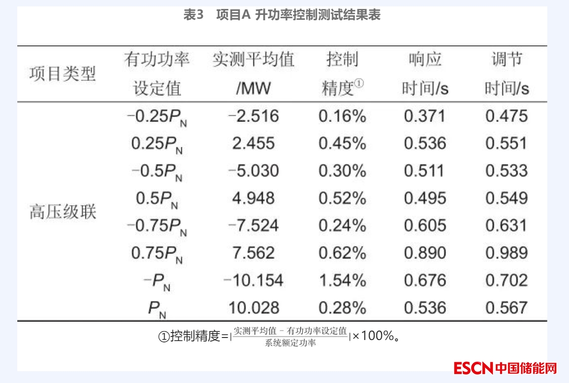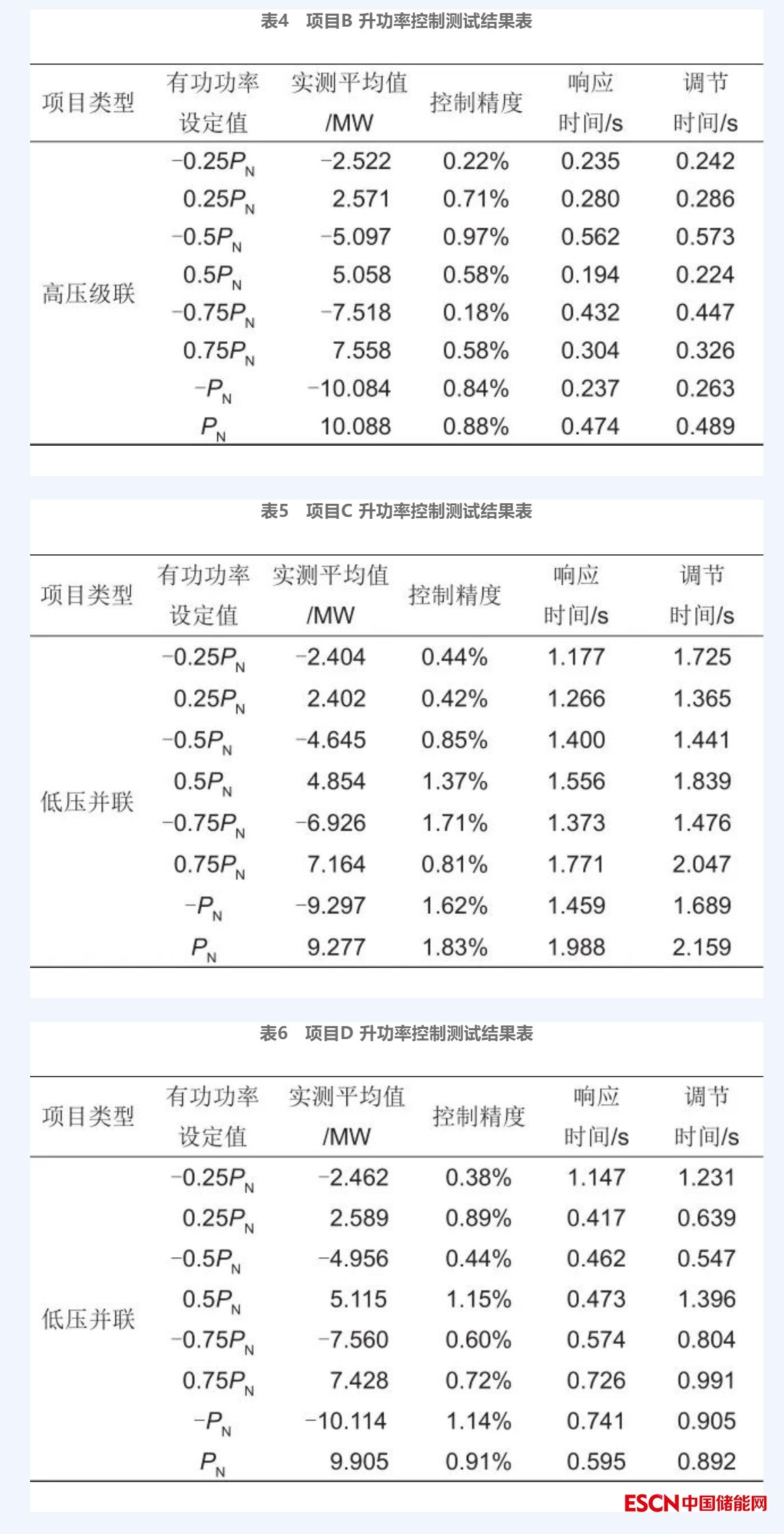 對(duì)4個(gè)項(xiàng)目進(jìn)行有功功率控制測(cè)試,選取升功率結(jié)果進(jìn)行分析,通過表3~表6的對(duì)比,總體上看,在有功控制性能測(cè)試方面,項(xiàng)目A、B的控制精度均值分別為0.51%和0.62%、響應(yīng)時(shí)間的均值分別為0.578 s和0.340 s、調(diào)節(jié)時(shí)間均值分別為0.625 s和0.356 s;項(xiàng)目C和項(xiàng)目D的控制精度均值分別為1.13%和0.78%、響應(yīng)時(shí)間的均值分別為1.499 s和0.642 s、調(diào)節(jié)時(shí)間均值分別為1.718 s和0.926 s;可以看出,高壓級(jí)聯(lián)儲(chǔ)能系統(tǒng)對(duì)功率的控制精度及控制時(shí)間較優(yōu)于低壓并聯(lián)儲(chǔ)能系統(tǒng)。在低壓并聯(lián)儲(chǔ)能系統(tǒng)中,以5 MW儲(chǔ)能單元為例,儲(chǔ)能管理系統(tǒng)在接收到指令后需要將指令下發(fā)到儲(chǔ)能單元,每個(gè)儲(chǔ)能單元通過8臺(tái)PCS控制電池出力,完成相應(yīng)指令。而在高壓級(jí)聯(lián)儲(chǔ)能系統(tǒng)中,儲(chǔ)能單元只需要通過控制1臺(tái)PCS便可完成對(duì)電池的控制,因此縮短了響應(yīng)時(shí)間和調(diào)節(jié)時(shí)間。