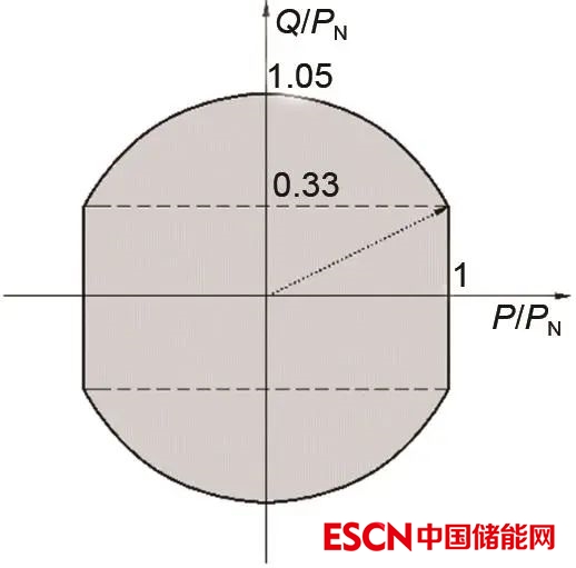 在功率控制方面,電化學(xué)儲(chǔ)能系統(tǒng)在其變流器額定功率運(yùn)行范圍內(nèi)應(yīng)具備四象限控制功能,有功功率和無功功率應(yīng)在圖5所示的陰影區(qū)域內(nèi)動(dòng)態(tài)可調(diào)。根據(jù)GB/T 36548—2018《電化學(xué)儲(chǔ)能系統(tǒng)接入電網(wǎng)測(cè)試規(guī)范》,測(cè)試方法如下: