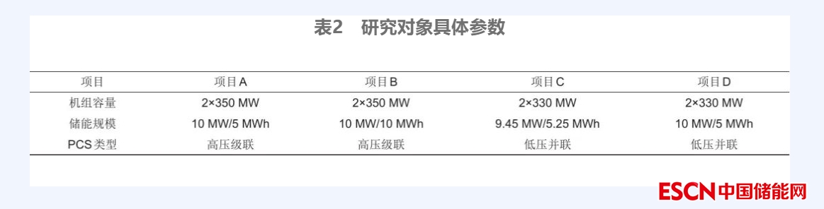 綜上所述,在火儲(chǔ)聯(lián)合調(diào)頻項(xiàng)目中,儲(chǔ)能系統(tǒng)的功率控制、充放電響應(yīng)時(shí)間以及能量轉(zhuǎn)換效率性能是衡量火儲(chǔ)聯(lián)調(diào)項(xiàng)目?jī)?chǔ)能系統(tǒng)集成效果的重要技術(shù)性指標(biāo)??紤]到試驗(yàn)樣本的一致性,以廣東省內(nèi)火電機(jī)組容量相近、儲(chǔ)能規(guī)模類似的4個(gè)火儲(chǔ)聯(lián)合調(diào)頻項(xiàng)目作為研究對(duì)象(項(xiàng)目具體參數(shù)見表2),通過設(shè)計(jì)試驗(yàn)方案對(duì)火儲(chǔ)聯(lián)合調(diào)頻項(xiàng)目中低壓并聯(lián)和高壓級(jí)聯(lián)的儲(chǔ)能系統(tǒng)進(jìn)行有功和無功功率控制、充放電響應(yīng)性能以及能量轉(zhuǎn)換效率對(duì)比分析,研究不同拓?fù)浣Y(jié)構(gòu)的儲(chǔ)能系統(tǒng)并網(wǎng)性能。