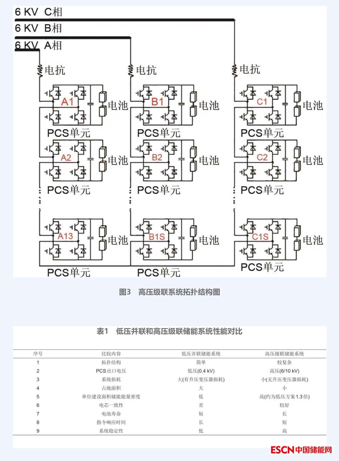 在高壓級(jí)聯(lián)儲(chǔ)能單元中,級(jí)聯(lián)儲(chǔ)能PCS的每個(gè)H橋單元由一個(gè)電池組和與之并聯(lián)的濾波電容及H橋逆變電路組成,輸出相電壓電平m=2N+1(N為功率變換單元數(shù)),輸出線電壓為4N+1電平;隨著功率變換單元的增加,會(huì)使得并網(wǎng)電流波形更加平滑。多個(gè)H橋單元交流側(cè)串聯(lián)作為級(jí)聯(lián)儲(chǔ)能PCS的一相,三相采用星形接線方式。相較于低壓并聯(lián),高壓級(jí)聯(lián)系統(tǒng)拓?fù)浣Y(jié)構(gòu)較為復(fù)雜,如圖3所示。低壓并聯(lián)和高壓級(jí)聯(lián)儲(chǔ)能系統(tǒng)性能對(duì)比如表1所示,高壓級(jí)聯(lián)儲(chǔ)能系統(tǒng)能夠直接輸出6 kV/10 kV,無需經(jīng)過變壓器,不僅減小系統(tǒng)損耗,提高效率,還減少了儲(chǔ)能系統(tǒng)的占地面積,降低了土地建設(shè)施工成本,提高了單位建設(shè)面積的能量密度。此外,在這種拓?fù)浣Y(jié)構(gòu)下,儲(chǔ)能系統(tǒng)能夠最大限度地減少或消除電池簇的并聯(lián)情況,使得各個(gè)電池簇之間相互獨(dú)立,減少或消除電池單體和電池簇的環(huán)流現(xiàn)象,削弱了儲(chǔ)能系統(tǒng)中電池一致性導(dǎo)致的問題,提高電池系統(tǒng)的循環(huán)壽命、降低了生產(chǎn)運(yùn)行的安全風(fēng)險(xiǎn)。高壓級(jí)聯(lián)儲(chǔ)能系統(tǒng)每三相為一組控制單元,儲(chǔ)能系統(tǒng)不需要根據(jù)并聯(lián)儲(chǔ)能單元性能的差異進(jìn)行協(xié)調(diào)后再響應(yīng)指令,縮短了儲(chǔ)能系統(tǒng)的響應(yīng)時(shí)間。高壓級(jí)聯(lián)的拓?fù)浣Y(jié)構(gòu)在低壓直流側(cè)可以減少開關(guān)損耗,進(jìn)一步提高系統(tǒng)效率;而且低壓側(cè)的電子元件所需電流及高壓側(cè)的電力元件所需耐壓等級(jí)均明顯降低,有利于提高系統(tǒng)的穩(wěn)定性。