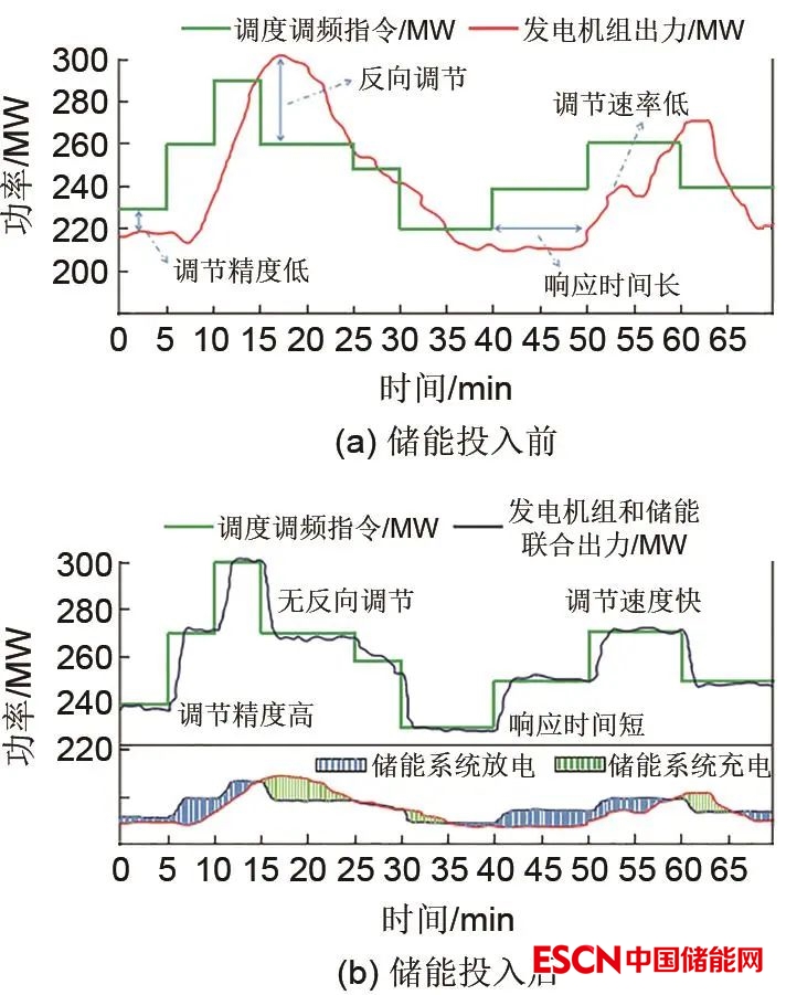 “雙碳”目標(biāo)下,由于能源的生產(chǎn)、消費(fèi)和利用呈現(xiàn)新的發(fā)展趨勢(shì),在此趨勢(shì)下電力系統(tǒng)的電源結(jié)構(gòu)、負(fù)荷特性、電網(wǎng)形態(tài)、技術(shù)基礎(chǔ)及運(yùn)行特性將發(fā)生深刻變化,構(gòu)建新型電力系統(tǒng)將面臨電力電量平衡、系統(tǒng)安全穩(wěn)定、新能源高效利用等挑戰(zhàn)。由于新能源發(fā)電具有波動(dòng)性及不確定性,會(huì)影響電網(wǎng)運(yùn)行的穩(wěn)定性,為了保障電網(wǎng)安全穩(wěn)定運(yùn)行,電力系統(tǒng)需要更多的靈活調(diào)頻資源來提升自身調(diào)節(jié)能力。火電機(jī)組作為我國(guó)重要的發(fā)電載體承擔(dān)著主要的調(diào)頻工作?;痣姍C(jī)組的自動(dòng)發(fā)電控制(automatic generation control,AGC)響應(yīng)時(shí)間長(zhǎng)、功率爬坡速度慢、穩(wěn)態(tài)精度低,無法滿足當(dāng)前的調(diào)頻需求。電化學(xué)儲(chǔ)能系統(tǒng)具有調(diào)節(jié)速率快、響應(yīng)時(shí)間短、調(diào)節(jié)精度高等優(yōu)點(diǎn),屬于優(yōu)質(zhì)的調(diào)頻資源,能夠有效彌補(bǔ)火電機(jī)組調(diào)頻性能的不足。圖1為某火電廠增加電池儲(chǔ)能系統(tǒng)前后AGC跟蹤曲線,增加儲(chǔ)能系統(tǒng)后,火電機(jī)組能有效提高發(fā)電單元的調(diào)節(jié)速率、縮短響應(yīng)時(shí)間、提高調(diào)節(jié)精度,提升綜合調(diào)頻性能,配合電力調(diào)度機(jī)構(gòu)改善電網(wǎng)的頻率波動(dòng),緩解電網(wǎng)調(diào)頻資源特別是優(yōu)質(zhì)調(diào)頻資源不足的問題。為了進(jìn)一步加強(qiáng)電化學(xué)儲(chǔ)能電站安全管理,國(guó)家能源局發(fā)布了《關(guān)于加強(qiáng)電化學(xué)儲(chǔ)能電站安全管理的通知》,由于電化學(xué)儲(chǔ)能系統(tǒng)并網(wǎng)后,其功率調(diào)節(jié)響應(yīng)、充放電的規(guī)律和保護(hù)功能等都會(huì)對(duì)機(jī)組和廠用電設(shè)備的可靠運(yùn)行產(chǎn)生影響。此外許多儲(chǔ)能項(xiàng)目還存在簡(jiǎn)單的堆砌現(xiàn)象,導(dǎo)致許多儲(chǔ)能輔助調(diào)頻項(xiàng)目存在能量效率不高、綜合調(diào)頻性能提升不明顯等問題。因此,為了保障儲(chǔ)能系統(tǒng)、機(jī)組及廠用電負(fù)荷的安全運(yùn)行,降低生產(chǎn)運(yùn)行風(fēng)險(xiǎn),電化學(xué)儲(chǔ)能調(diào)頻系統(tǒng)在并網(wǎng)前開展規(guī)范全面的并網(wǎng)檢測(cè)具有重要意義。