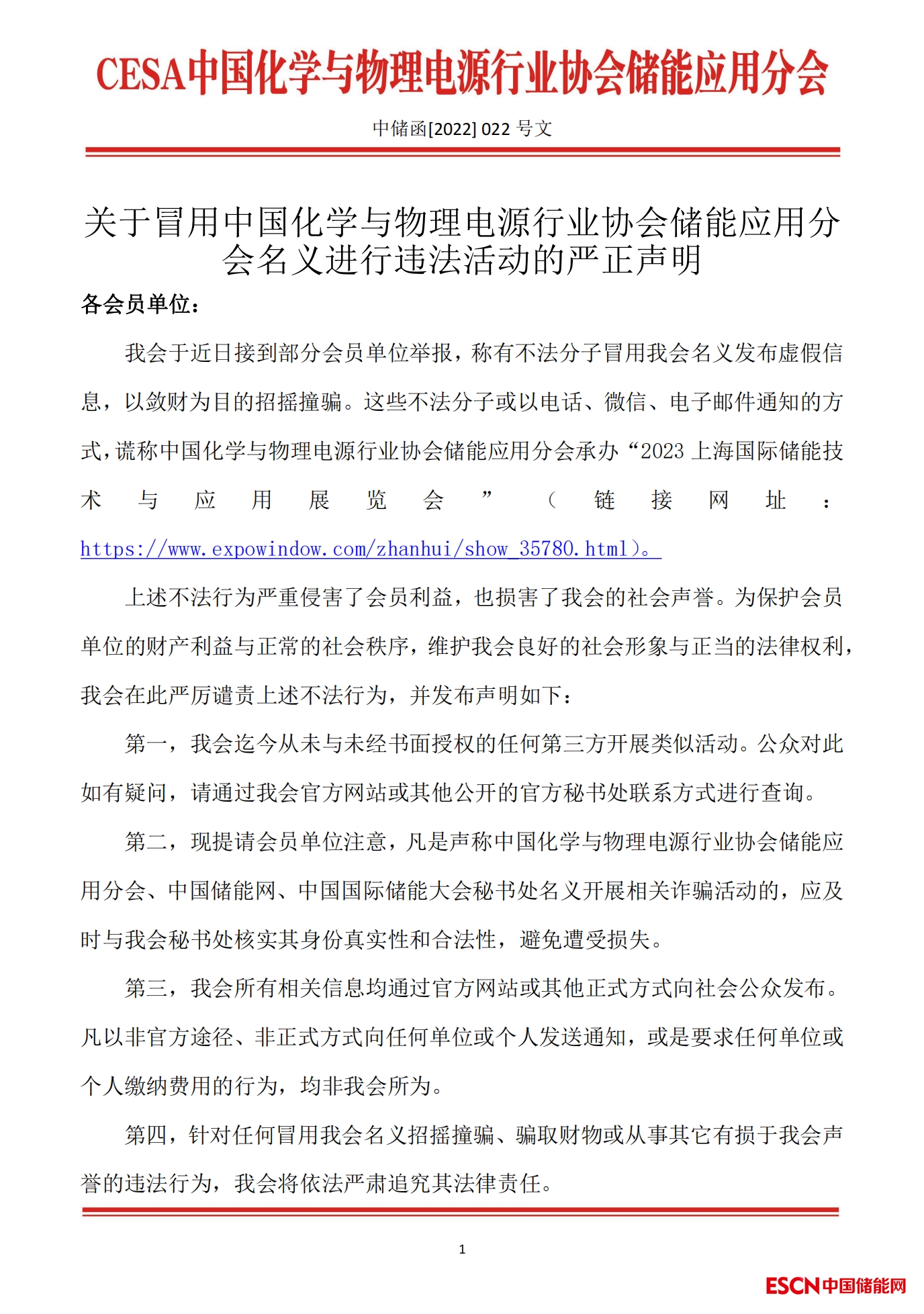 關于冒用中國化學與物理電源行業(yè)協(xié)會儲能應用分會名義進行違法活動的嚴正聲明