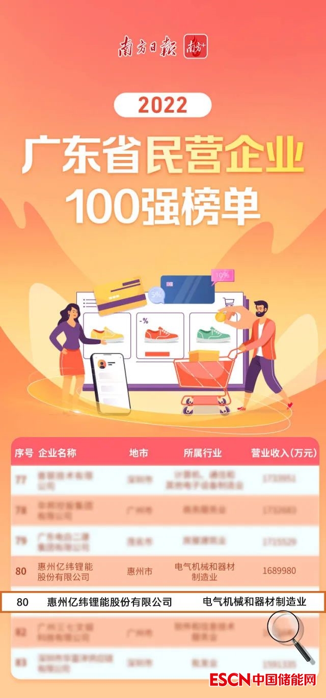 中國儲(chǔ)能網(wǎng)訊:近日,廣東省工商業(yè)聯(lián)合會(huì)(總商會(huì))發(fā)布“2022廣東省民營企業(yè)100強(qiáng)”系列榜單,億緯鋰能榮登“2022廣東民營企業(yè)100強(qiáng)榜單”,位列第80名;同時(shí),上榜“2022廣東省制造業(yè)民營企業(yè)100強(qiáng)榜單”,位列第42名。